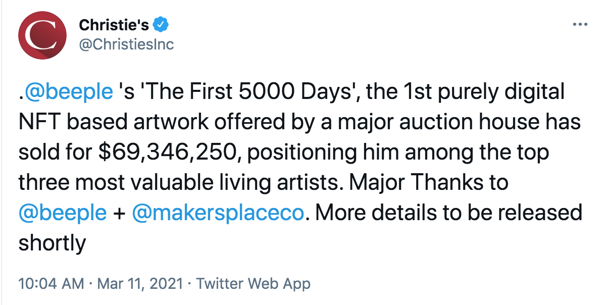 一枚非同质化代币在拍卖会上以6900万美元的价格售出,不错。关于艺术的事情在于它是主观审美判断的问题。Beeple看起来很酷,但对我来说,购买一个指向一堆在他的Twitter上免费提供的数字图像的独特区块链指针在审美上并不那么吸引人。我宁愿购买一幅卡拉瓦乔的作品。