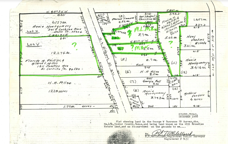 一项调查显示作者家族在德克萨斯东部的土地。来源:诺埃尔·米勒(Noel Miller Jr.)我的曾祖父母威尔和芭芭拉·布罗迪进入了一块位于德克萨斯东部一个叫吉尔默的小镇上的一大片土地。从达拉斯开车大约需要两个小时。这片土地最初用来种植玉米、秋葵和豆类,随着布罗迪夫妇年老离世,被分割给多个家庭——这里一小块,那里一片。一团糟。