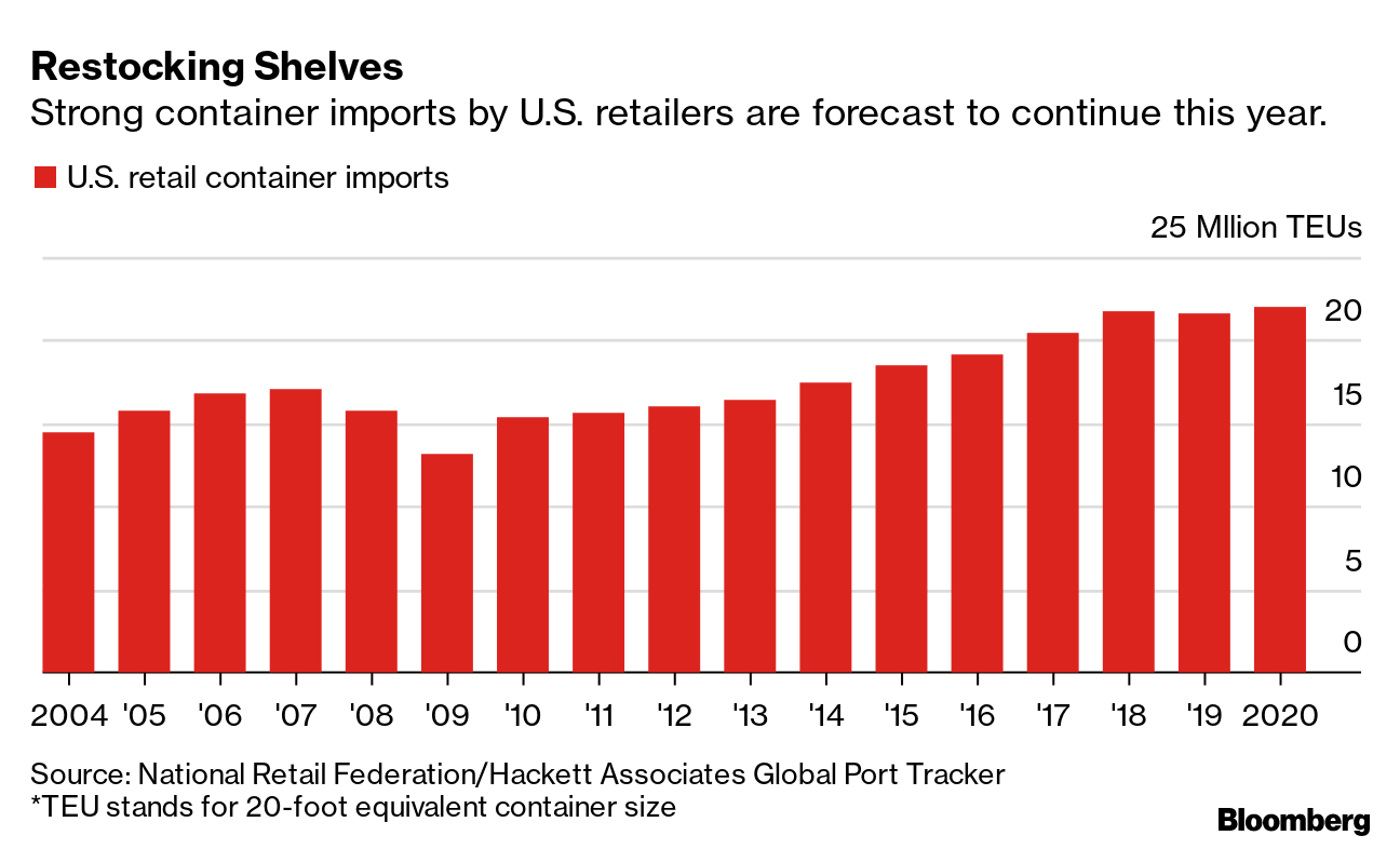全国零售联合会本周表示,预计美国最大的零售集装箱港口的进口量在2021年上半年将“大幅增长”。