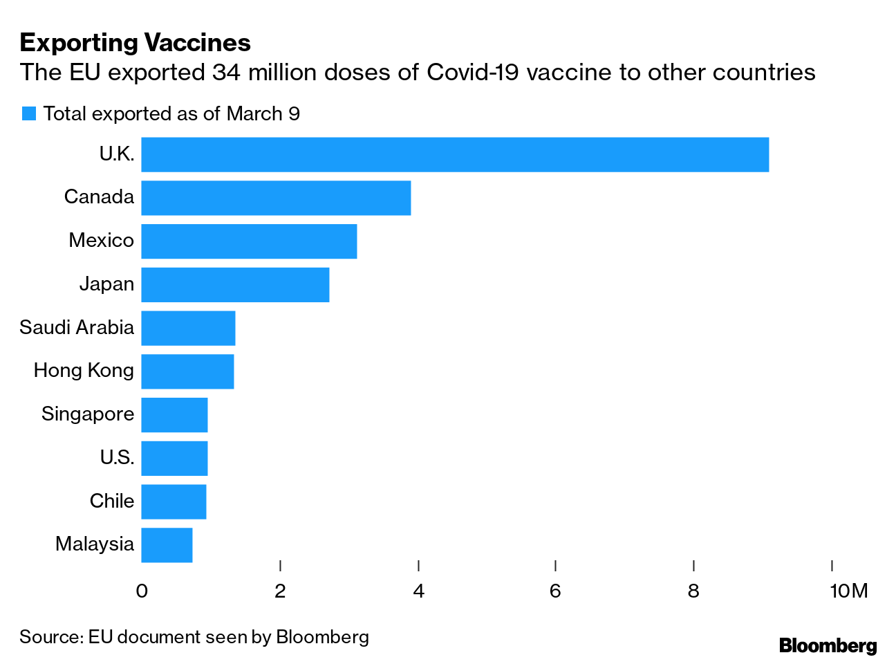 欧盟向其他国家出口了3400万剂新冠疫苗,其中包括910万剂出口到英国,根据彭博社看到的文件。高级欧盟官员敦促英国公开其疫苗出口情况,此举是在一场日益紧张的争端中,欧盟指责英国实施出口禁令。这里有一个快速了解当前局势的文章。
