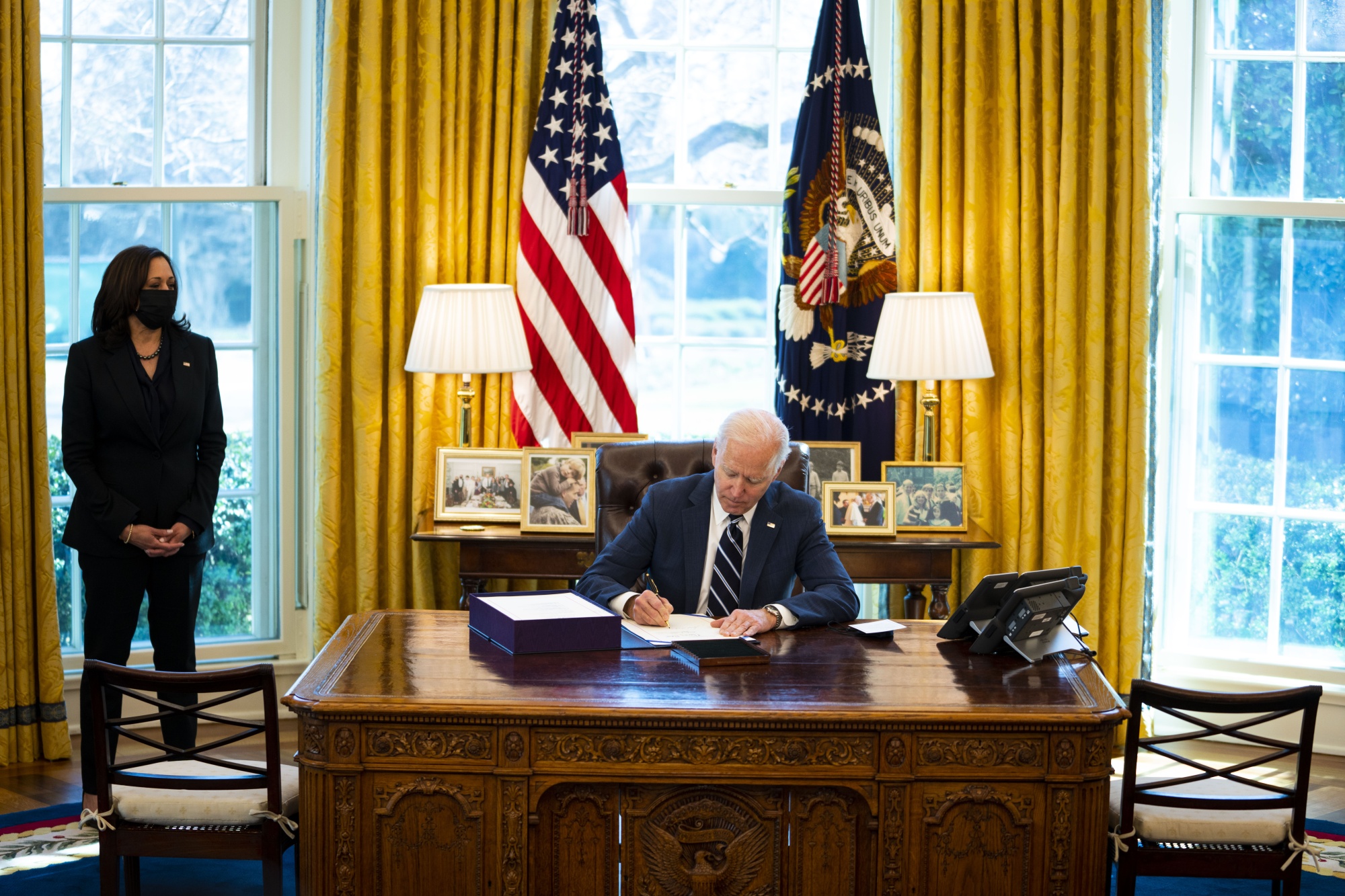 乔·拜登在白宫椭圆形办公室签署了美国拯救计划,日期为3月11日。