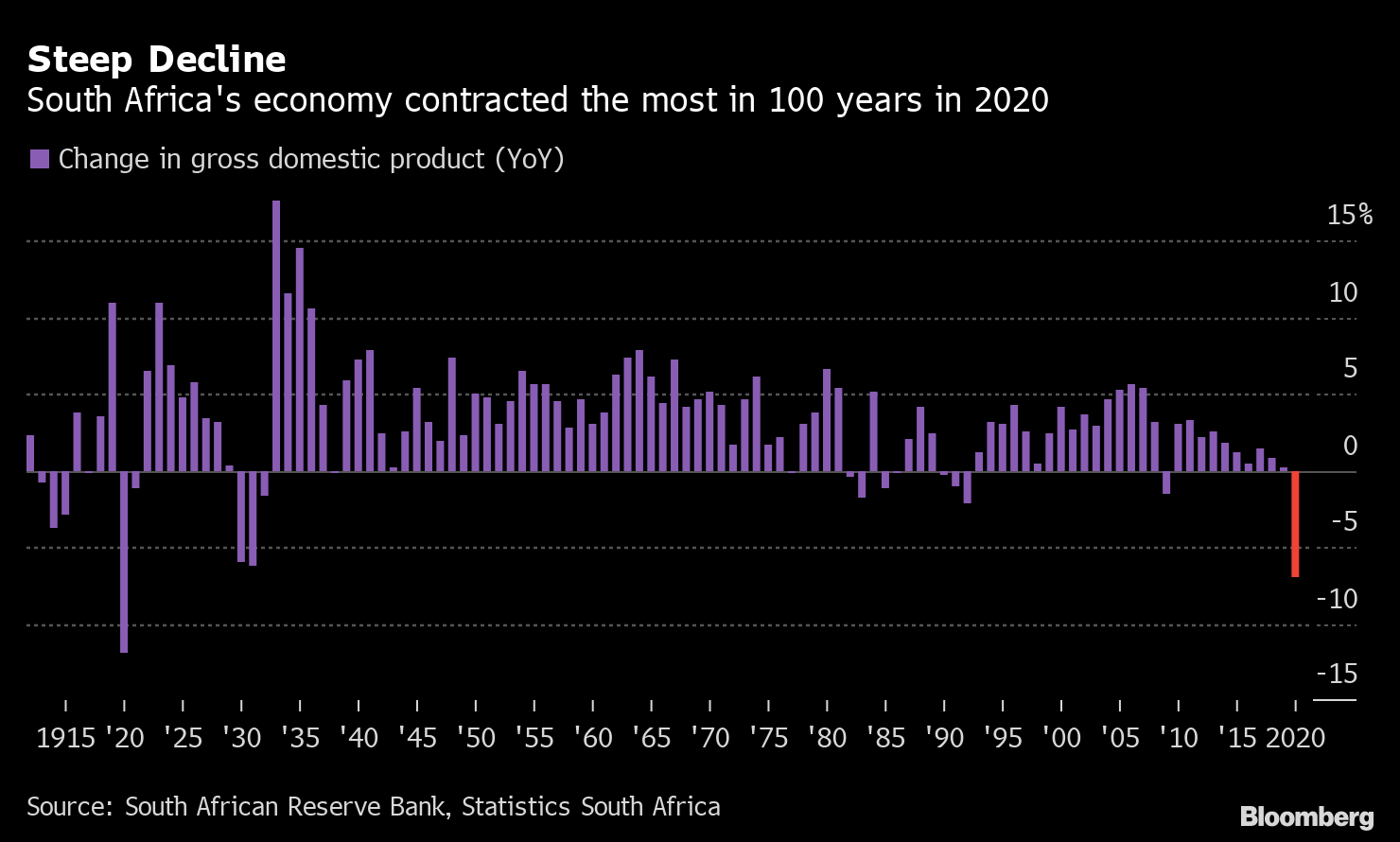 - 南非经济在2020年因为为遏制冠状病毒大流行而实施的限制措施而遭受了一个世纪以来最严重的萎缩,这些措施摧毁了产出并扰乱了贸易。国内生产总值下降了7%,是自1920年以来最大的下降,但这一降幅比国家财政部在其年度预算中预测的要小。