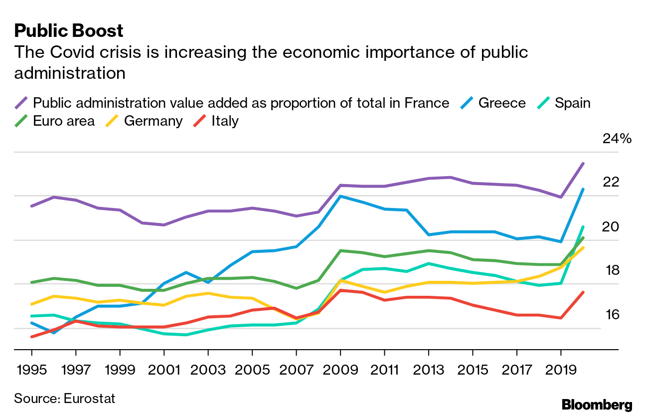 由于冠状病毒危机的后果使其他经济部门的重要性下降,公共管理在整个欧元区的作用正在增加,导致国家被赋予新的职责。去年,公共管理在整个欧元区经济中的权重达到了自1995年系列开始以来的最高水平。法国的公共部门占该国总增加值的23.5%,在百分比方面是欧元区最大的。