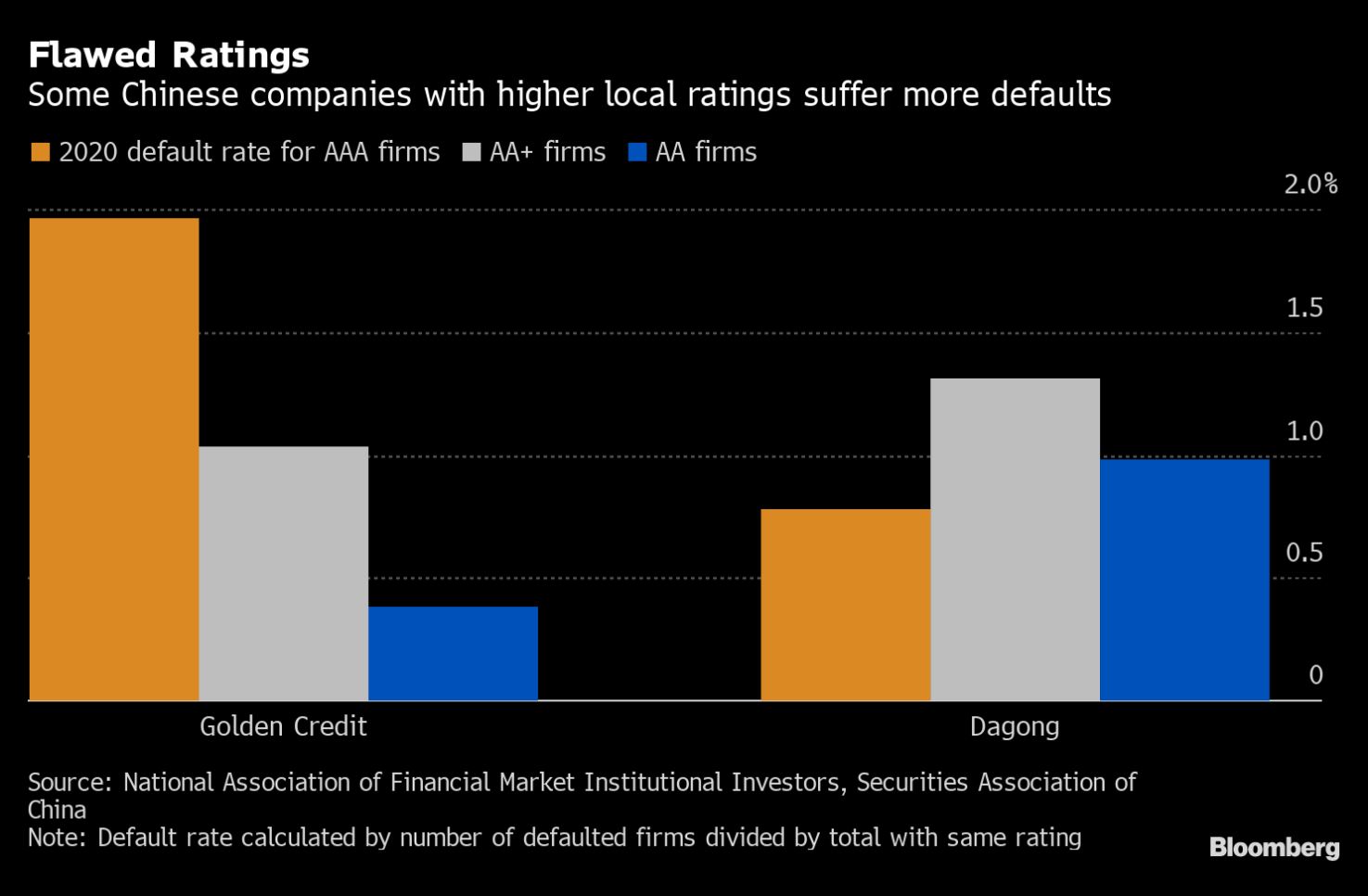 Bloomberg正如他所说,报告描述了一个“颠倒的评级”系统,即去年获得较高信用评级的公司最终更有可能违约。例如,Golden信用评级给予AAA评级的公司中,有1.96%在2020年违约,而较不值得信赖且获得AA评级的公司中,有0.38%违约。在大公国际信用评级公司,AA+评级的公司比AA评级略低的公司更频繁地违约。中国显然希望在其信用市场中鼓励更多的差异化,但我认为这并不完全符合投资者的期望。因此,该国的信用评级机构正受到越来越多的审查。