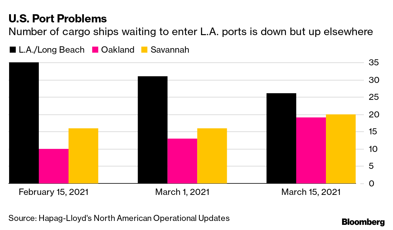 停靠在洛杉矶和长滩港口外的货船数量有所下降,但在加利福尼亚州奥克兰和乔治亚州萨凡纳,类似的拥堵情况正在加剧,这是来自Hapag-Lloyd的最新统计数据。哥本哈根SeaIntelligence Consulting的Lars Jensen在LinkedIn上发文称,按照目前的改善速度,洛杉矶-长滩需要再花费10周时间清理积压货物。