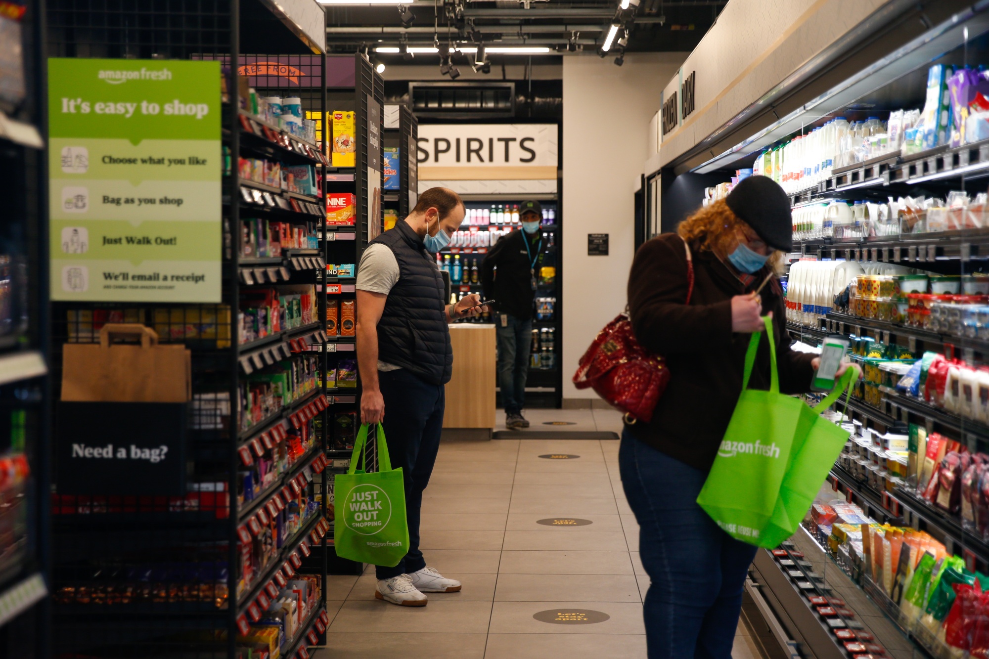 顾客在英国伦敦伊灵地区的亚马逊Amazon Fresh无收银员便利店购物,拍摄于3月4日。
