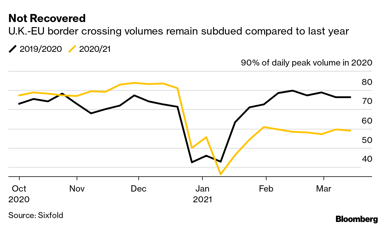 根据咨询公司Sixfold的高频数据,英国与欧洲其他地区的贸易仍低于一年前的水平。根据物流平台Transporeon的数据,进出口的每周平均过境量比一年前同期下降了约五分之一。