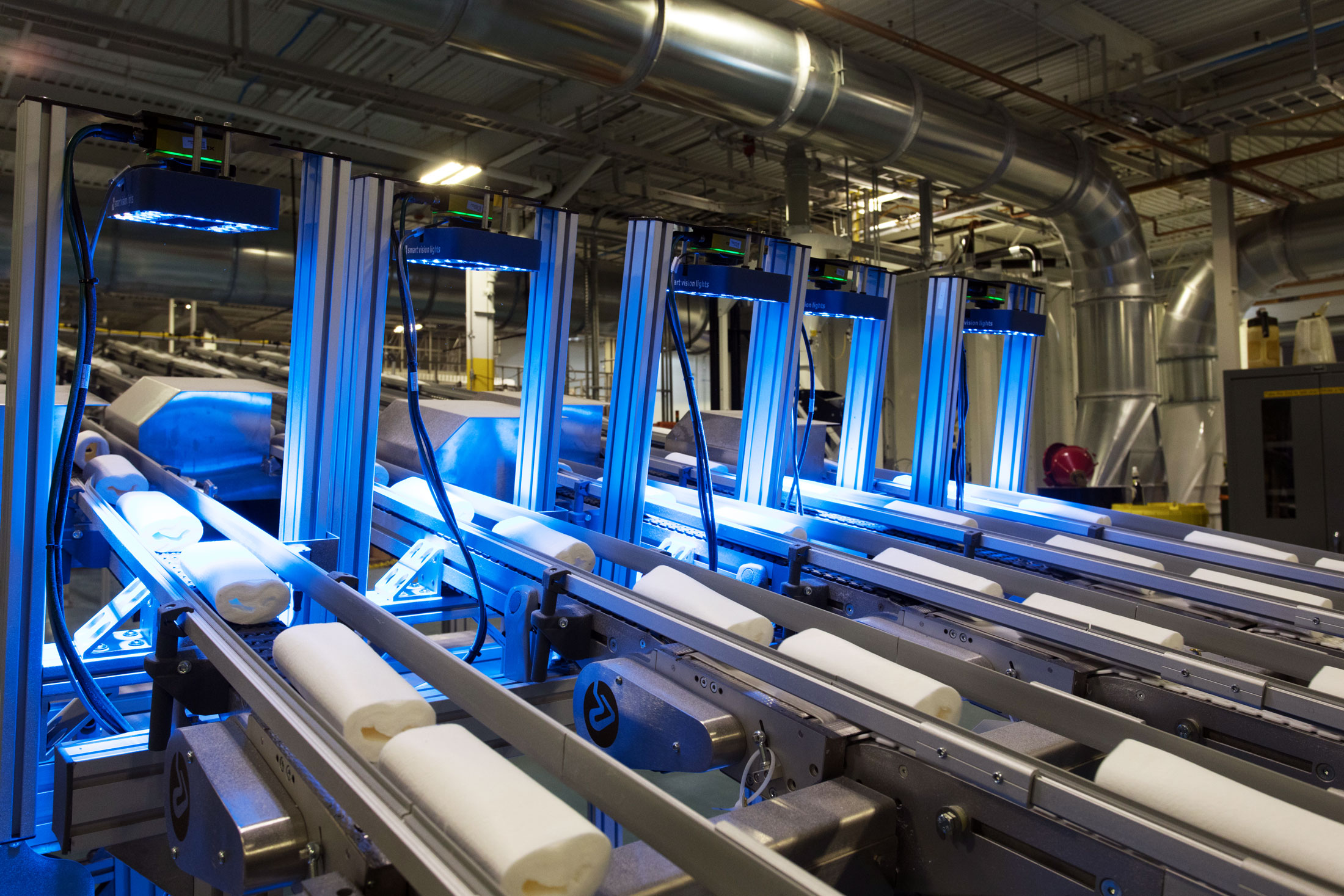在这个占地258,000平方英尺的综合大楼内,你可以感受到公司的紧迫感。巨大的无纺布卷——消费者称之为擦拭产品的方形纸张——被卷在卷轴上并切成片。快速的传送带将它们运送到装罐机中。一个机器人手臂将成品整理好,然后放在比工厂的任何一名员工都高的托盘上。在全产能状态下,可以在八小时内生产50万个单位。