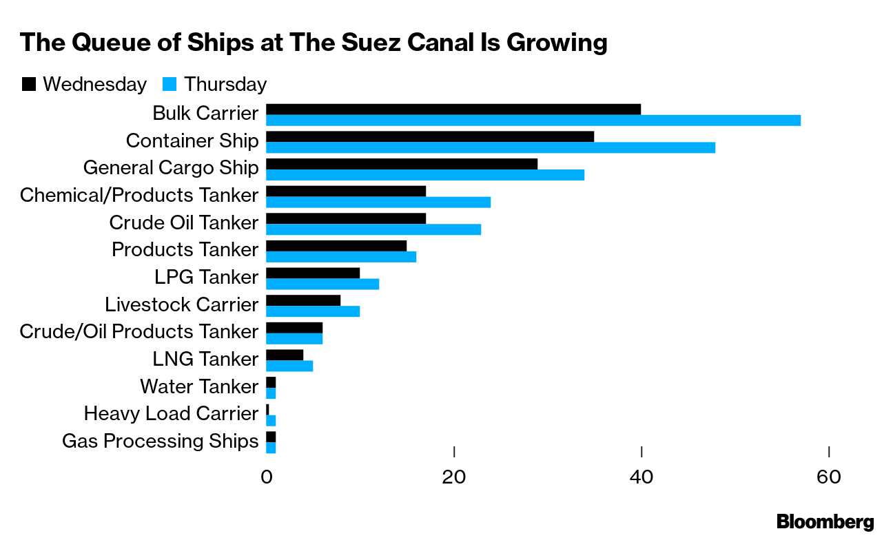 努力解除堵塞苏伊士运河的巨大“长赐”集装箱船将至少需要到下周三,比最初担心的时间更长,这增加了这一事件可能引发全球供应链中断的可能性。以下是彭博社的一些报道: