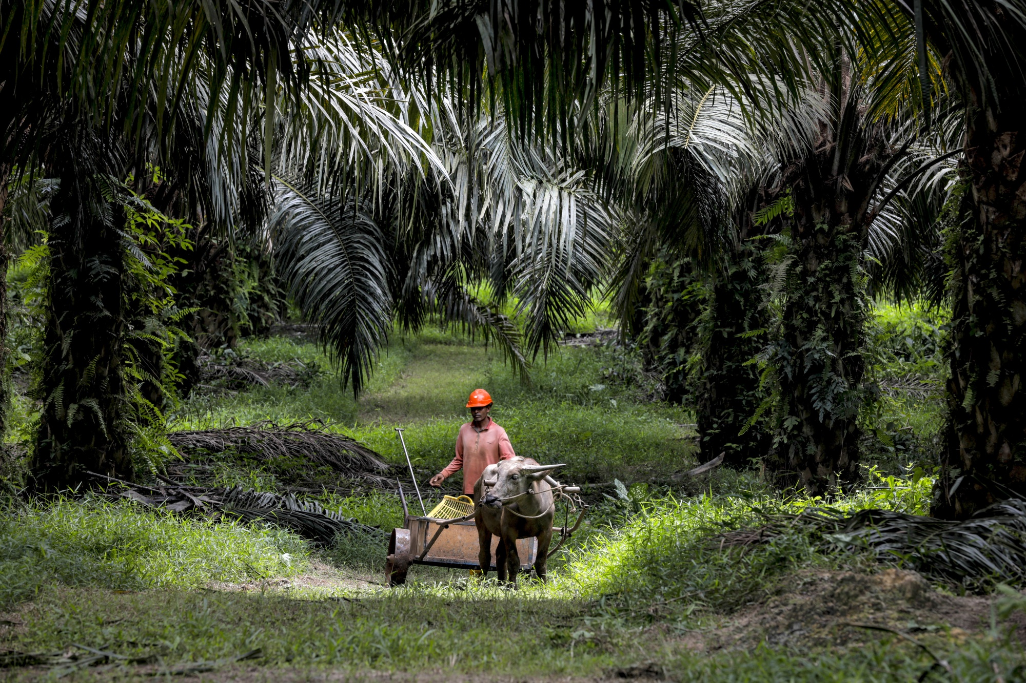 一名工人使用牛车运输在马来西亚柔佛州Gemas的IOI Corp. Gomali棕榈油庄园收获的棕榈油果串,