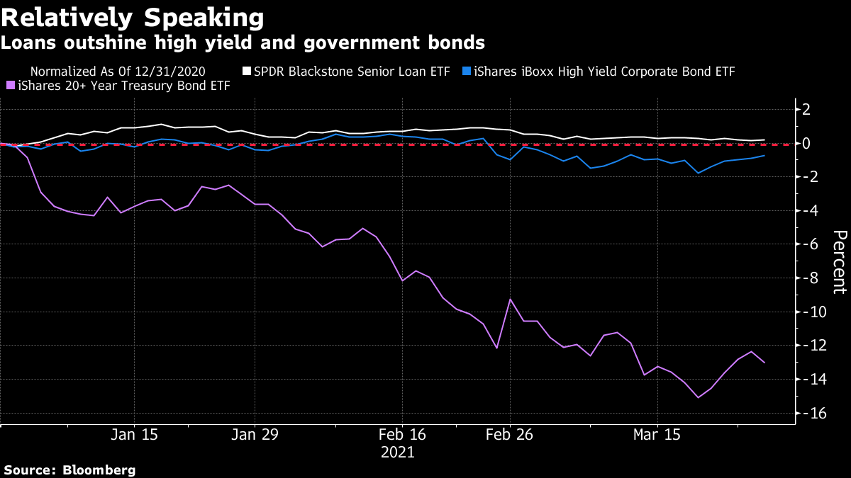 就像目前债券市场中的大多数事情一样,这种差异也归结为对久期的担忧——或者说资产对利率变化的敏感性。这推动了对超短期贷款交易所交易基金的需求,相对于高收益债券,这些基金几乎没有久期风险,而高收益债券通常比高评级同行更不容易受到利率上涨的影响。此外,由于贷款具有浮动利率,它们实际上有望从利率上升中受益。