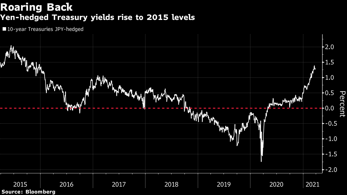 这很自然地引出了一个喜欢的话题:套汇的国债收益率。外国债券买家的套汇成本——主要由短期利率差异决定——在去年三月美联储将利率削减至接近零之后急剧下降。在那次紧急削减之前,海外投资者在保护免受外汇波动影响后在美国债券市场面临着严重的负收益。