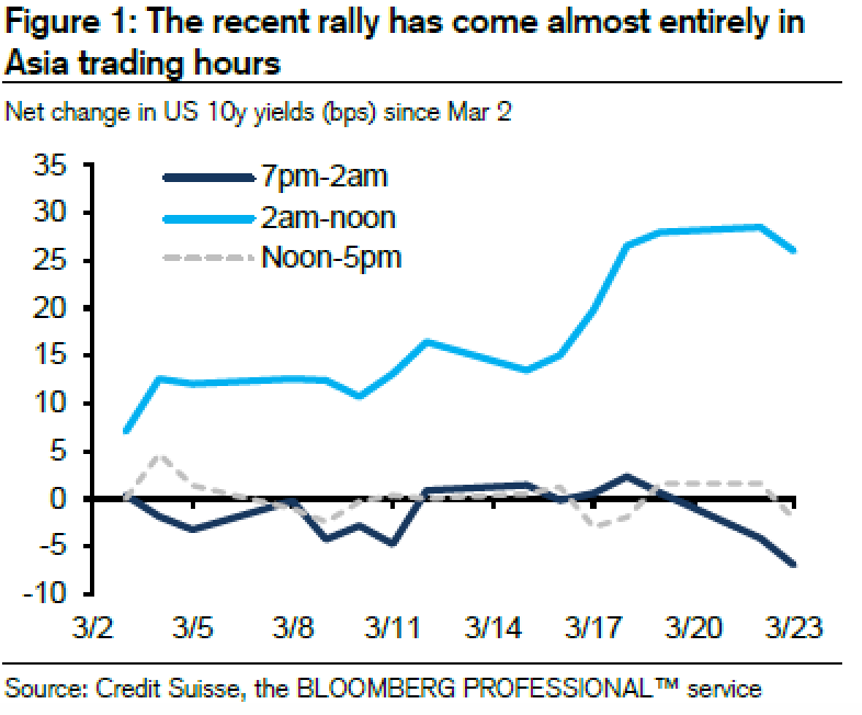 隔夜涨势是美国股指期货中一个被广泛记录的现象,但在国债市场中并不那么明显,直到现在或许是这样。瑞士信贷本周的一份报告指出,自3月初以来,国债在亚洲交易时段一直在上涨,然后在美国交易时段典型的情况下回落。根据该银行的数据,截至3月23日,纽约时间晚上7点至凌晨2点之间,10年期国债收益率下降了近10个基点,然后在凌晨2点至中午之间上升了大约25个基点。