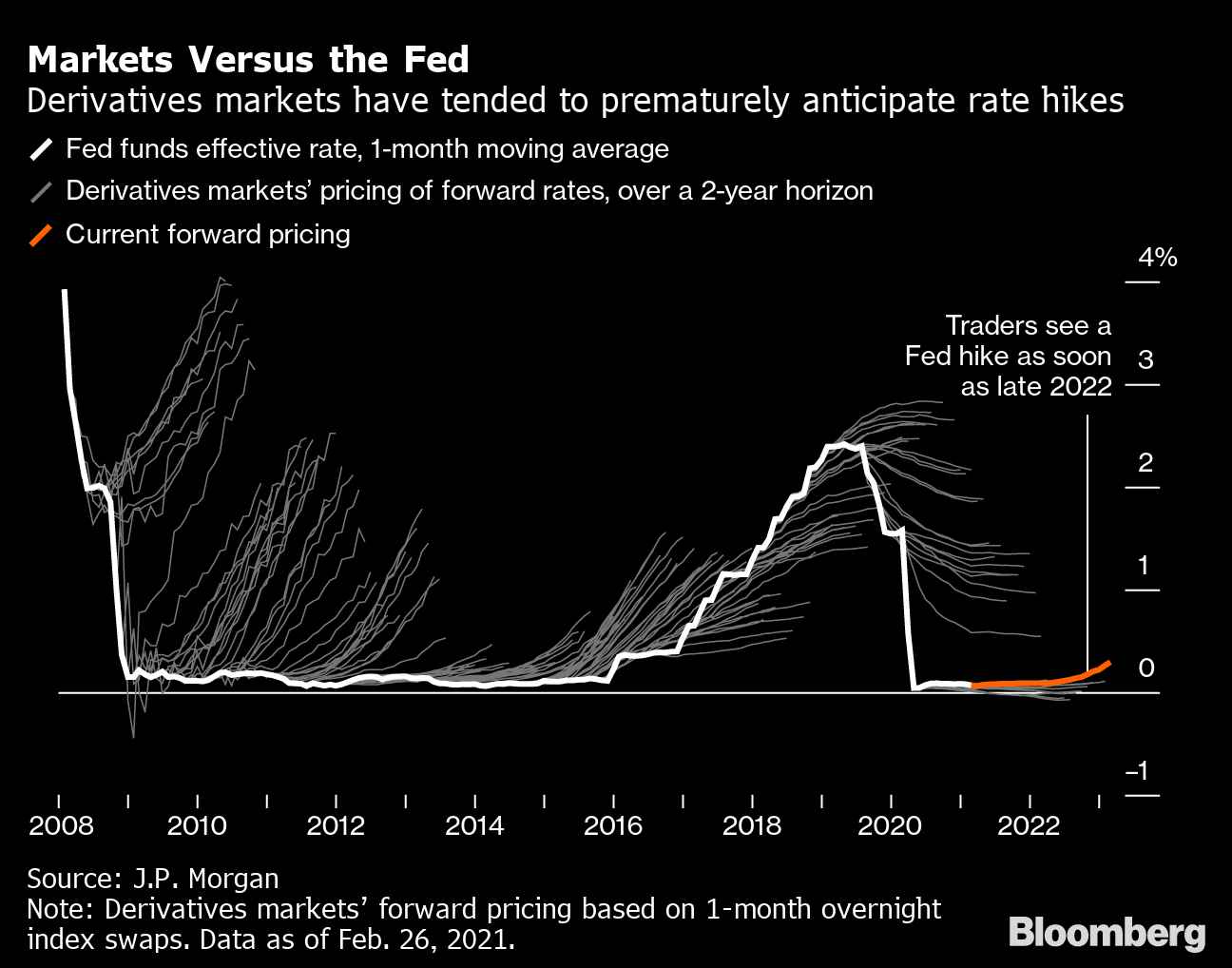 事实证明,债券交易员在时机把握上相当糟糕。虽然这听起来像是在批评,但这也是彭博新闻的一篇文章得出的有趣结论,该文章审视了过去13年的货币市场衍生品。自2008年以来,市场一直在定价比实际发生的更激进的美联储加息路径。以2008年底的情况为例:根据摩根大通公司的数据,交易员已经在为未来几年的多次加息做准备,但政策制定者一直推迟到2015年才开始收紧政策。