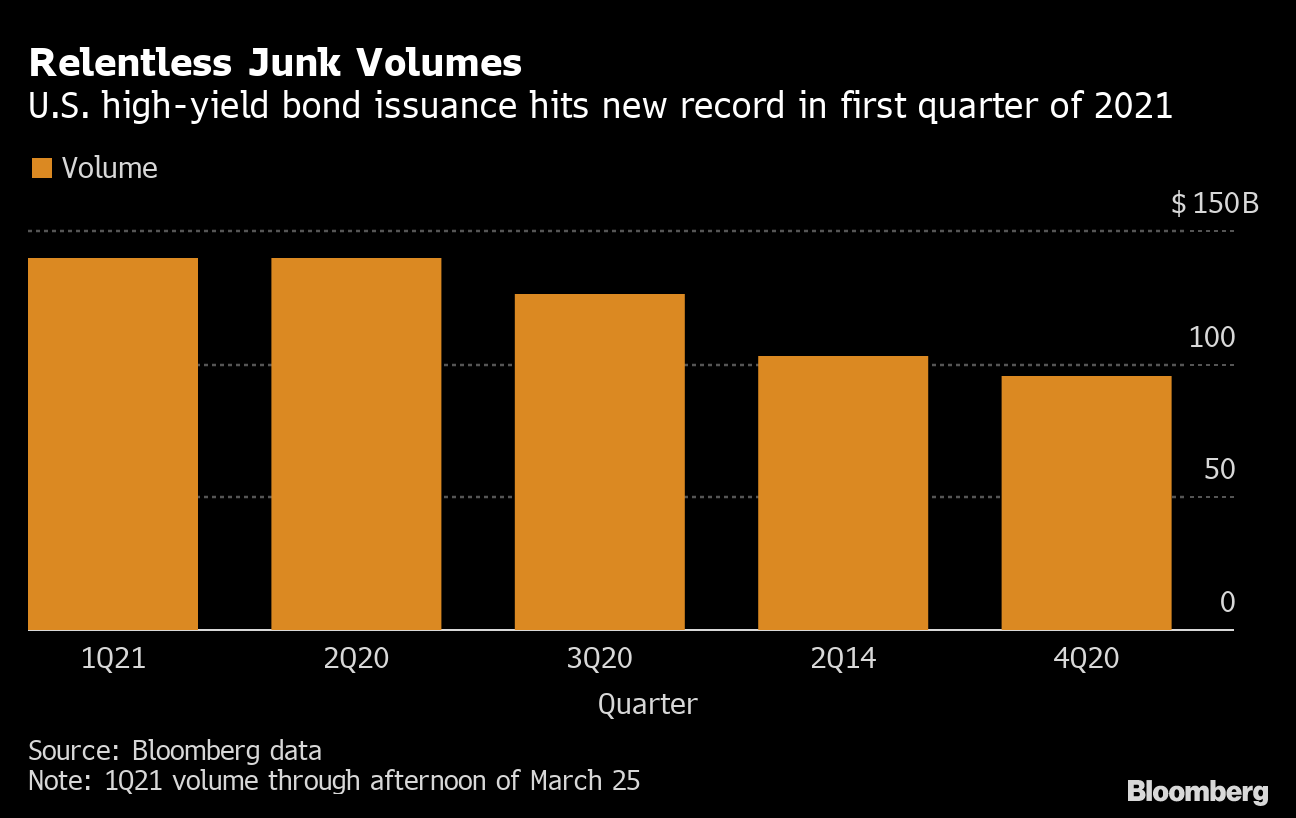 高收益债券处于一个有趣的位置。最近初级市场一直很火爆——彭博社编制的数据显示,周四晚些时候Carvana Co.的发行使季度总发行额达到了创纪录的1396亿美元,超过了2020年第二季度设定的1390亿美元的前高,当时美联储宣布其信贷市场支持措施解冻了被新冠疫情冻结的市场。