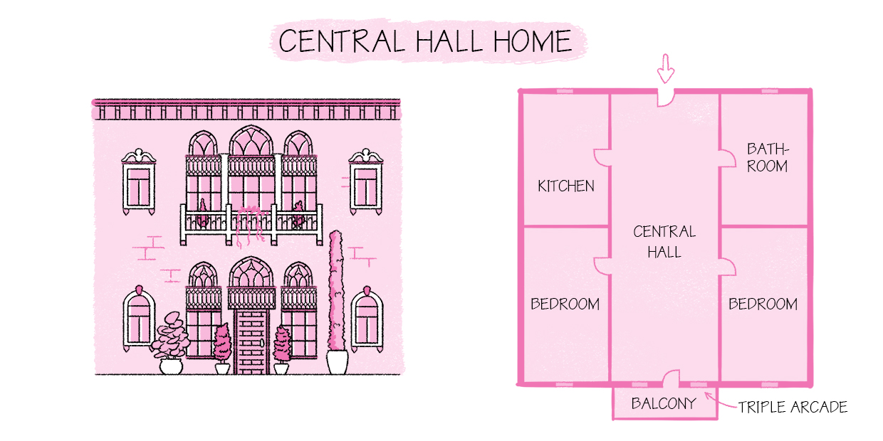 这些新的精英阶层希望当代的家居环境与他们的愿望相匹配。传统上,黎巴嫩的房屋是大型的、类似大厅的空间,有时围绕着一个开放的庭院,内部几乎没有隔断。白天用于娱乐的空间可能在晚上变成睡房。中央大厅打破了这种模式,保留了开放的中央区域,但将独立的卧室、厨房和浴室放置在周围,使得大厅既充当共用中庭又充当走廊。这些私人区域带来了一个引人注目的新颖之处——隐私。然而,家庭的功能和装饰核心仍然是大厅,通常在一端由三个华丽的拱形窗户照亮。