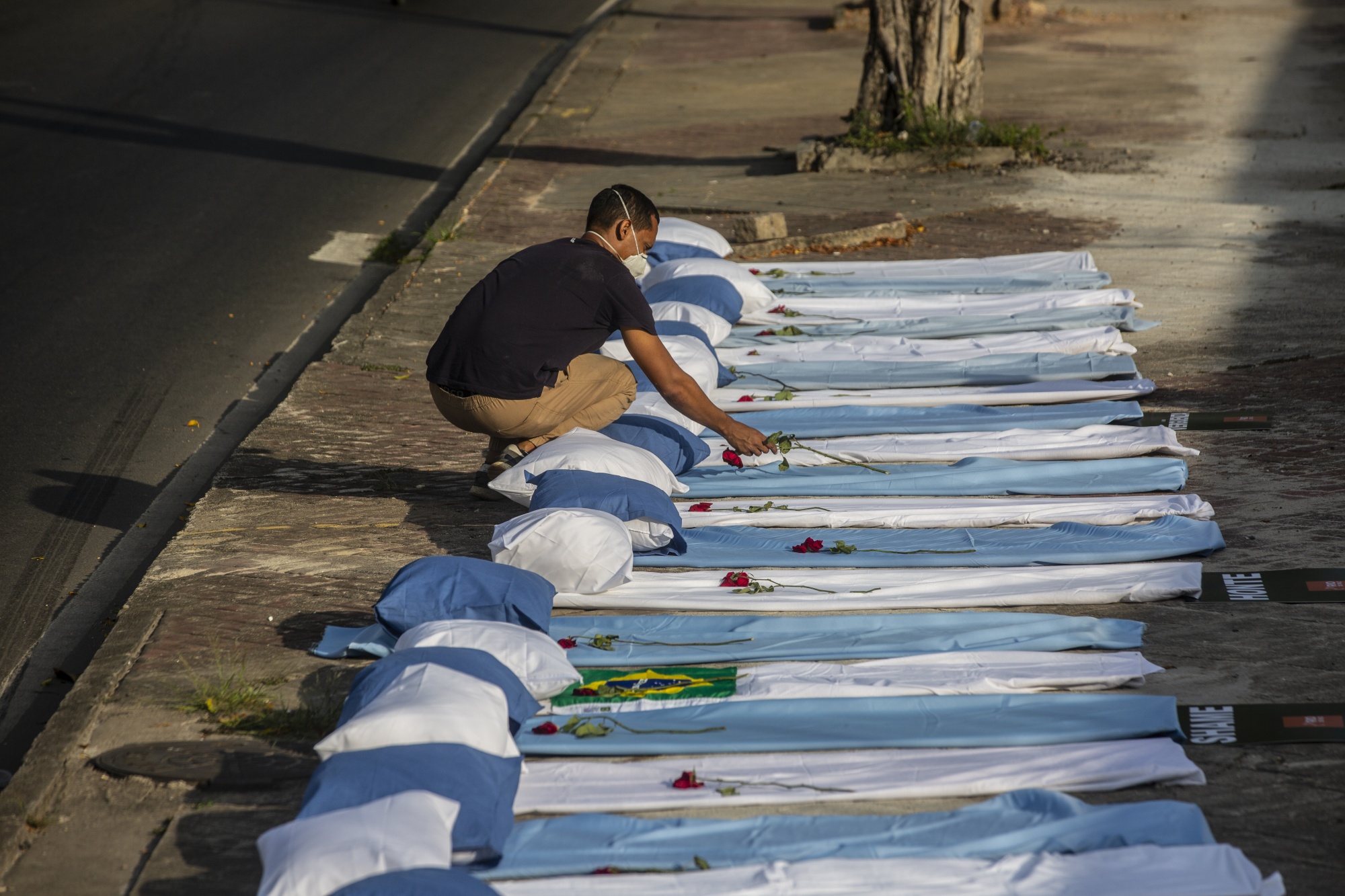 一名示威者在里约热内卢的劳尔·加佐拉医院外抗议政府的疫情应对措施,他把一朵玫瑰放在一个被摆成担架样式的毯子上。