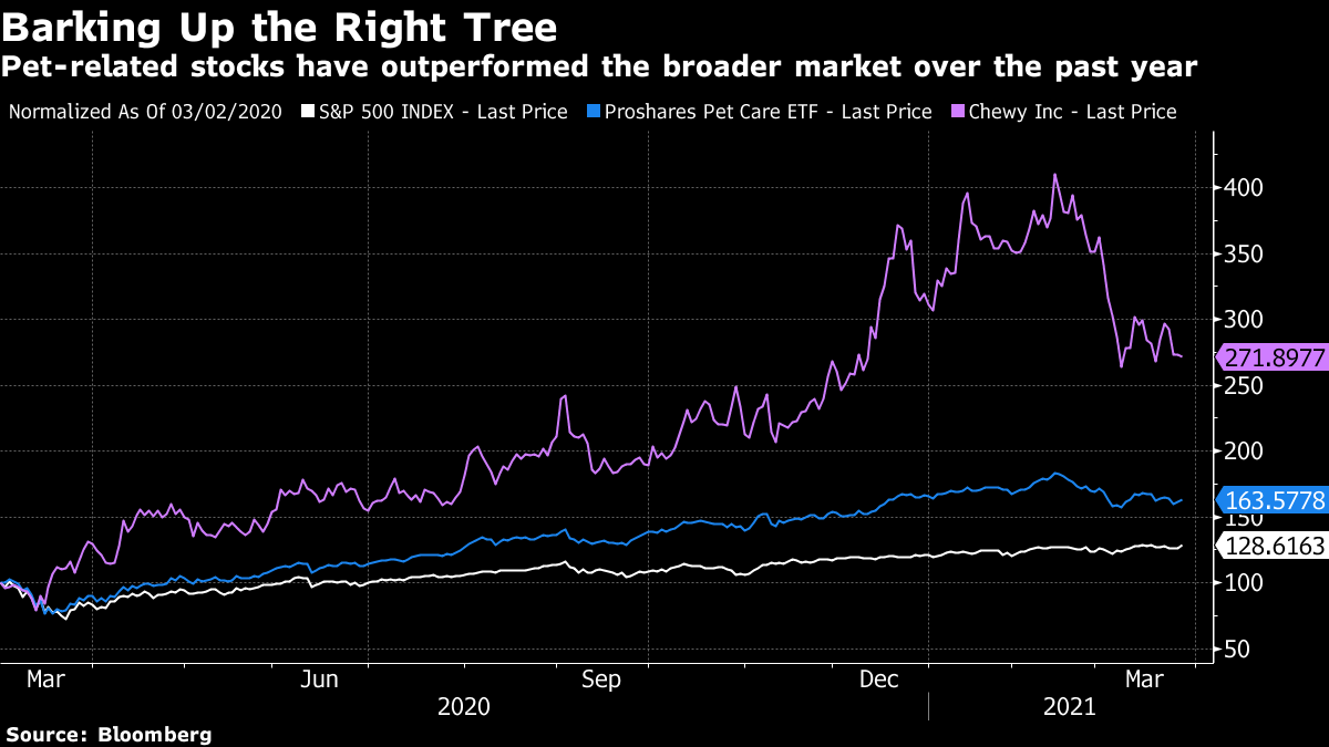 当然,宠物热潮中有赚钱的机会。自疫情爆发以来,ProShares宠物护理交易基金(更为人熟知的是PAWZ)和在线宠物用品商店Chewy的表现均优于更广泛的指数。但也有人担心关于毛孩子热潮能够持续多久,美国的收容所对新领养的狗狗在主人不得不回到办公室时会发生什么表示担忧。