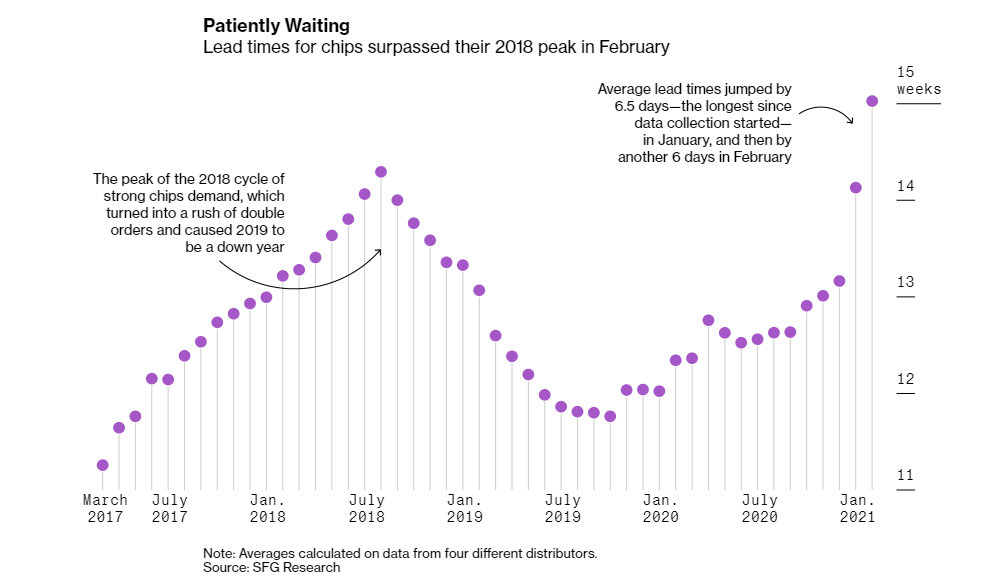 一个有六十年历史的发明,芯片,已经从在强大计算机中被很少人理解的工作马变成了现代设备引擎盖下最关键和昂贵的组件。这种需求爆炸 — 在 Covid-19 大流行期间出乎意料地推动了某些行业(如智能手机和个人电脑)的需求 — 导致了近期供应冲击,引发了前所未有的全球短缺。二月份,交货时间平均延长到了2017年开始数据收集以来的15周。