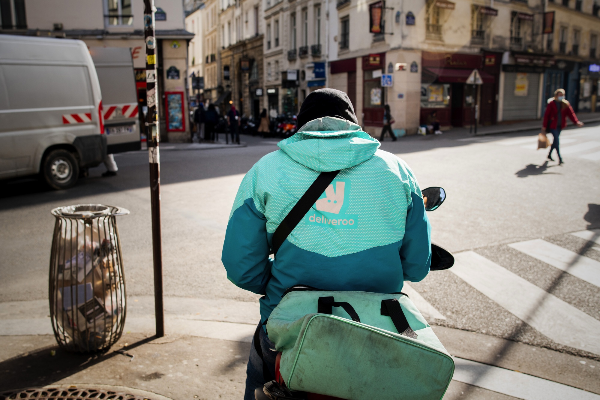 一名Deliveroo送餐员在巴黎等待客户订单。