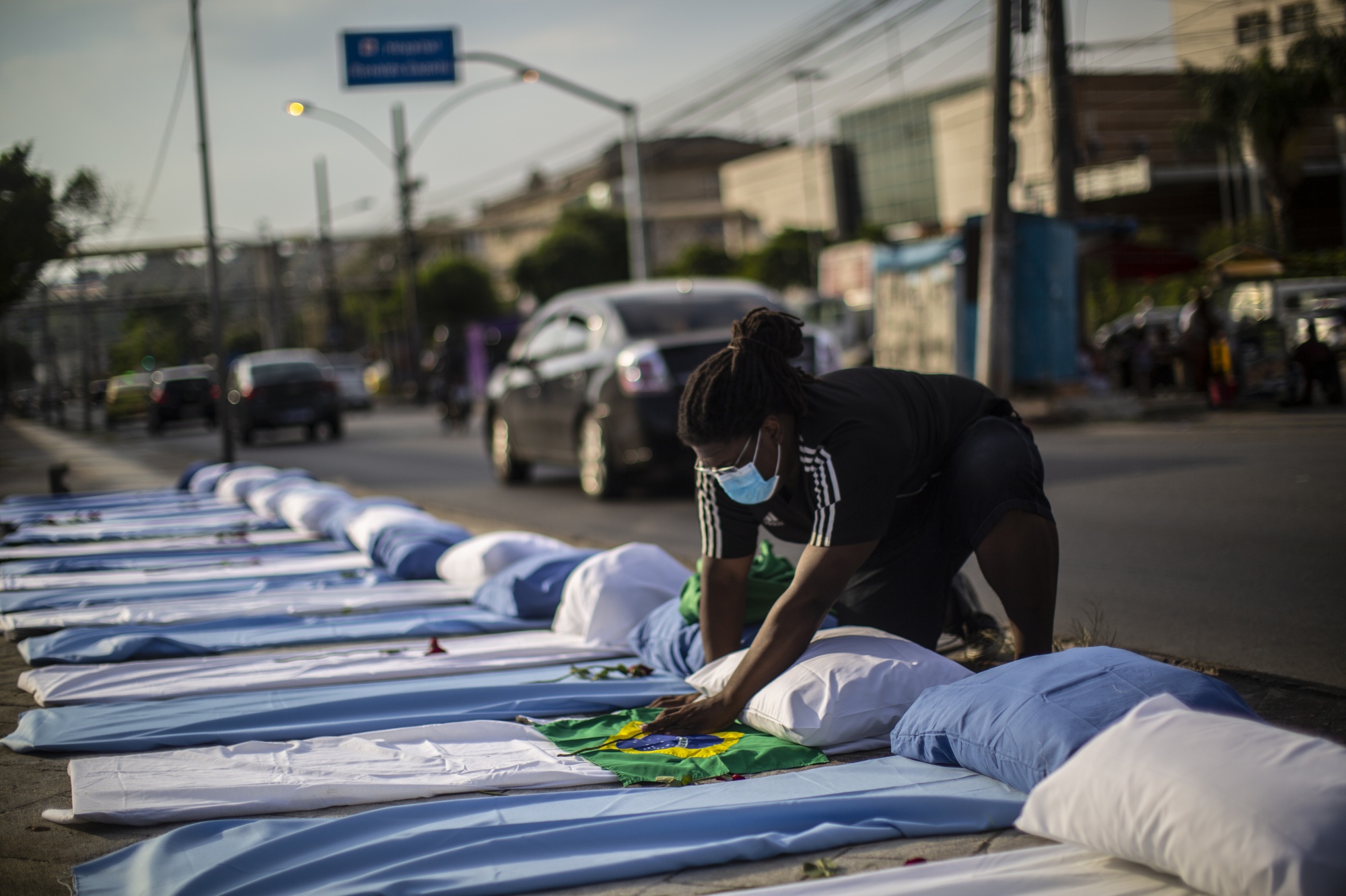 一名示威者在里约热内卢的劳尔·加佐拉医院外抗议政府的疫情应对措施期间,将一面旗帜摆放在一条毯子上,以模拟担架。