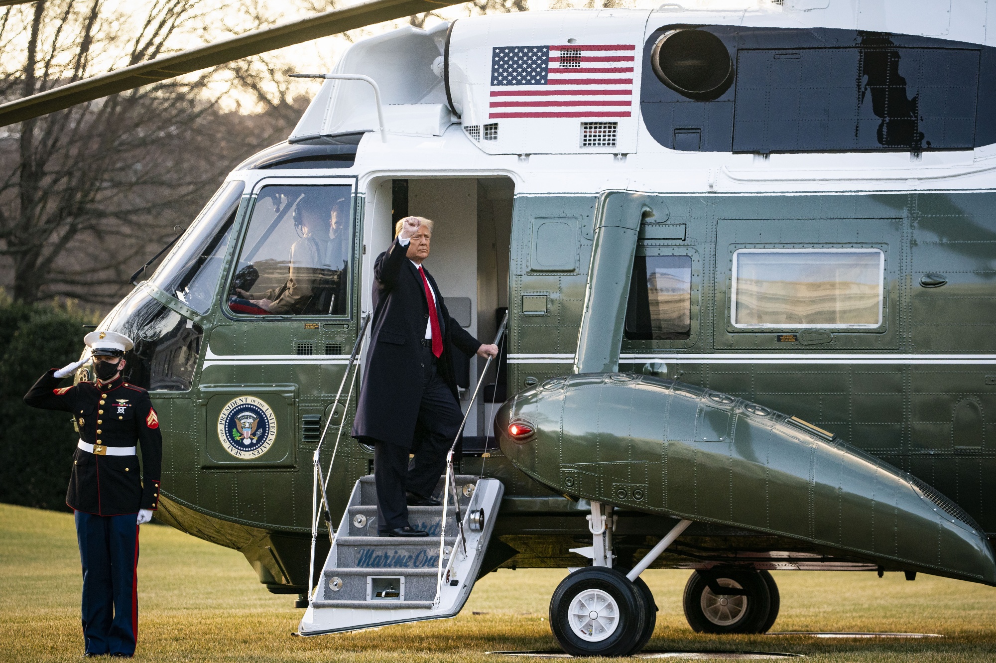 美国总统唐纳德·特朗普在2021年1月20日登上华盛顿特区白宫南草坪的“海军一号”时做出手势。