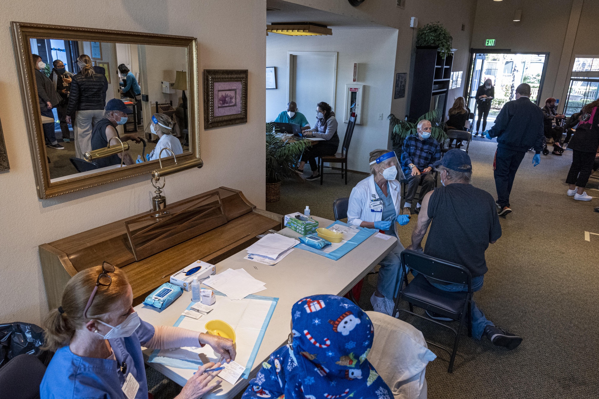 马林县的一个移动疫苗团队在圣拉斐尔Commons为人们接种疫苗。
