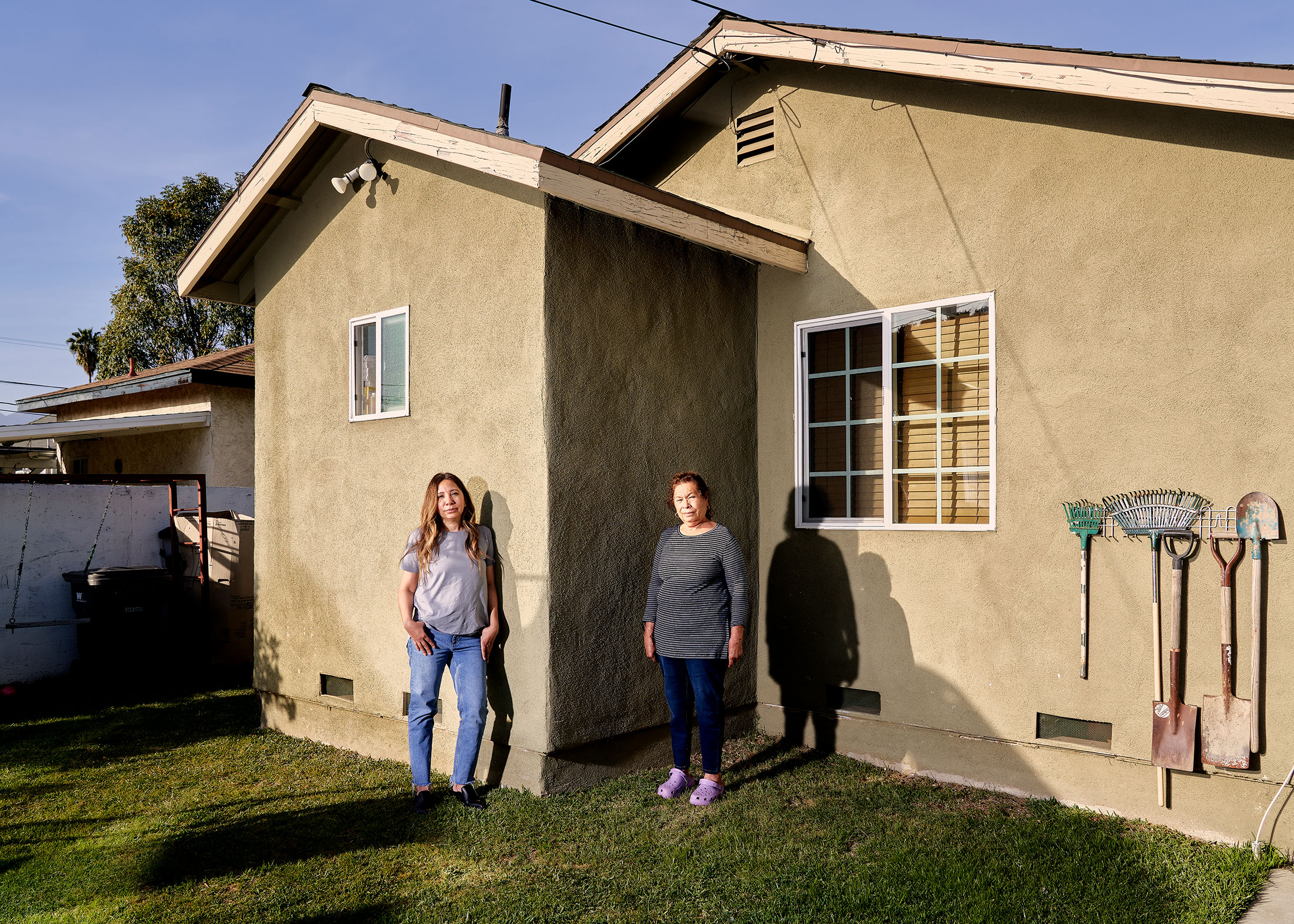 **Blanca Garduno 和 Socorro Tamayo 来自加利福尼亚州鲍德温公园。**Tamayo(右)在2019年惊讶地发现她的年度房产税支付额增加了超过4,000美元。前一年,Tamayo 在屋顶安装了太阳能电池板,并且她认为自己已经通过电力公用事业公司参加了一个能够减少她年度能源账单的计划。她不确定太阳能电池板是否在发挥作用,她的能源账单仍然没变。摄影师:Philip Cheung 摄于彭博环保“你认为如果他报价42,000美元,我会同意吗?我去哪里弄那么多钱?”
