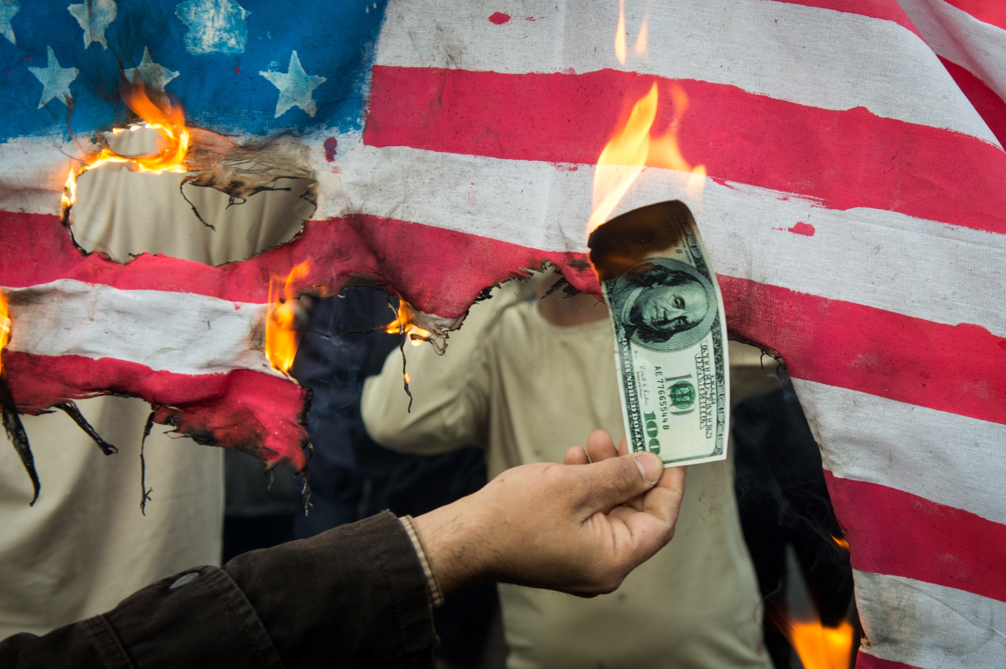抗议者在2018年11月德黑兰美国大使馆被占领纪念日焚烧美国国旗和美元。