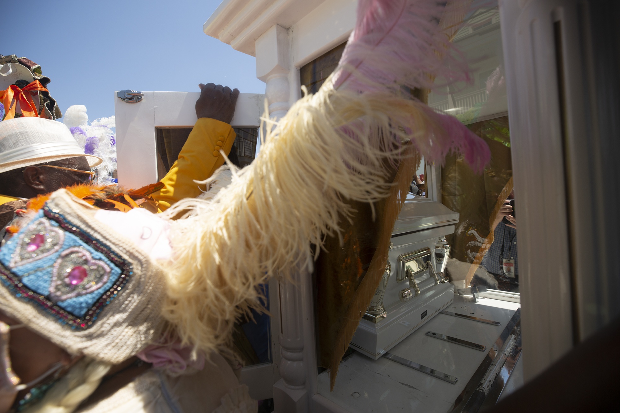 金·布特的葬礼,Fi Yi Yi的大王,在2020年8月。摄影师:L. Kasimu Harris/FRONTLINE(PBS)整个社区,整个城市 — 包括我们在内 — 我们不得不重新组织以应对这一情况。人们自然而然地聚集在一起纪念她。有一个仪式,人们释放气球以纪念她,他们进行这些精神仪式来承认她。而且关于新奥尔良的有趣之处,可能在全国范围内并不会如此公开地发生,就是在进行第二行进时的一些事情,你参加一个葬礼服务,然后走出葬礼服务,直接走上街头,播放一首悲伤的歌曲。然后有一个时刻,你释放身体。然后会发生更多庆祝的事情。