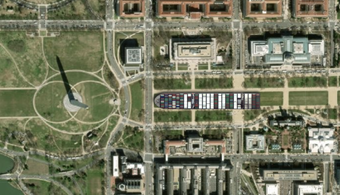 将船只放大或缩小的能力也提供了有用的地理课程。“很难想象一艘货船有多大,”纳尔逊说。“但如果你之前在华盛顿特区的国家广场周围走过,然后把“长赐号”拖进国家广场,现在就会有一种感官上的现实感。”