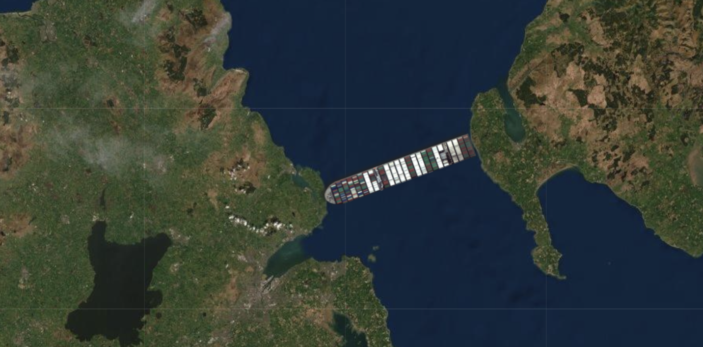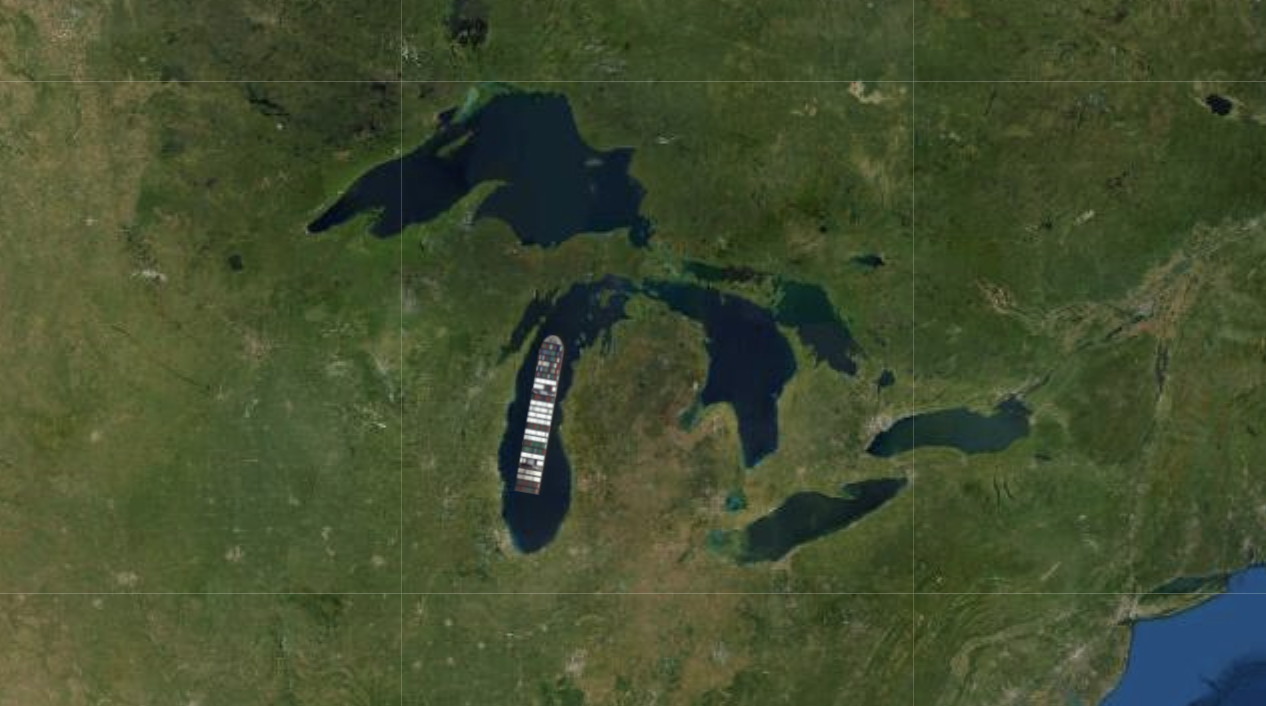 五大湖正面临一种情况。(船不按比例。)截图:长赐号,无处不在但他的俏皮贡献似乎也触动了更深层次的弦。全球消费者通常不必费心思考关键材料和商品是如何进入我们的家园和城市的。但当长赐号被困时,我们被提醒它们确实来自 某个地方。然而,那个地方仍然相当匿名——如果你从未去过苏伊士运河,它几乎可以是任何地方。