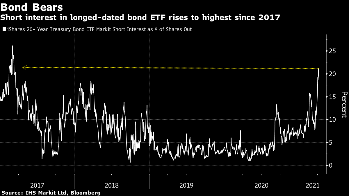 上个月对国债的攻击可能已经平息,但随着债券守夜人准备发动下一轮攻击,战斗似乎将会重新开始。正如我的同事Katherine Greifeld指出的那样,根据IHS Markit的数据,本周对价值140亿美元的iShares 20+年期国库券ETF的空头利息攀升到了流通股份的五分之一左右。这是自2017年初以来的最高水平,也是对长期债券看跌赌注需求的迹象,这一趋势在期货市场中也有所体现。