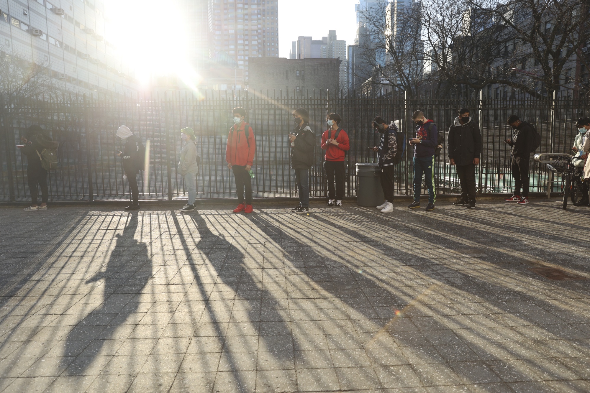 学生们在3月22日排队进入纽约市一所公立高中。摄影师:安格斯·莫丹特/彭博社与更具传染性的英国变种有关的新感染已经引发了拜登卫生顾问的新警告,并给他重新开放教室的努力增加了阻力。