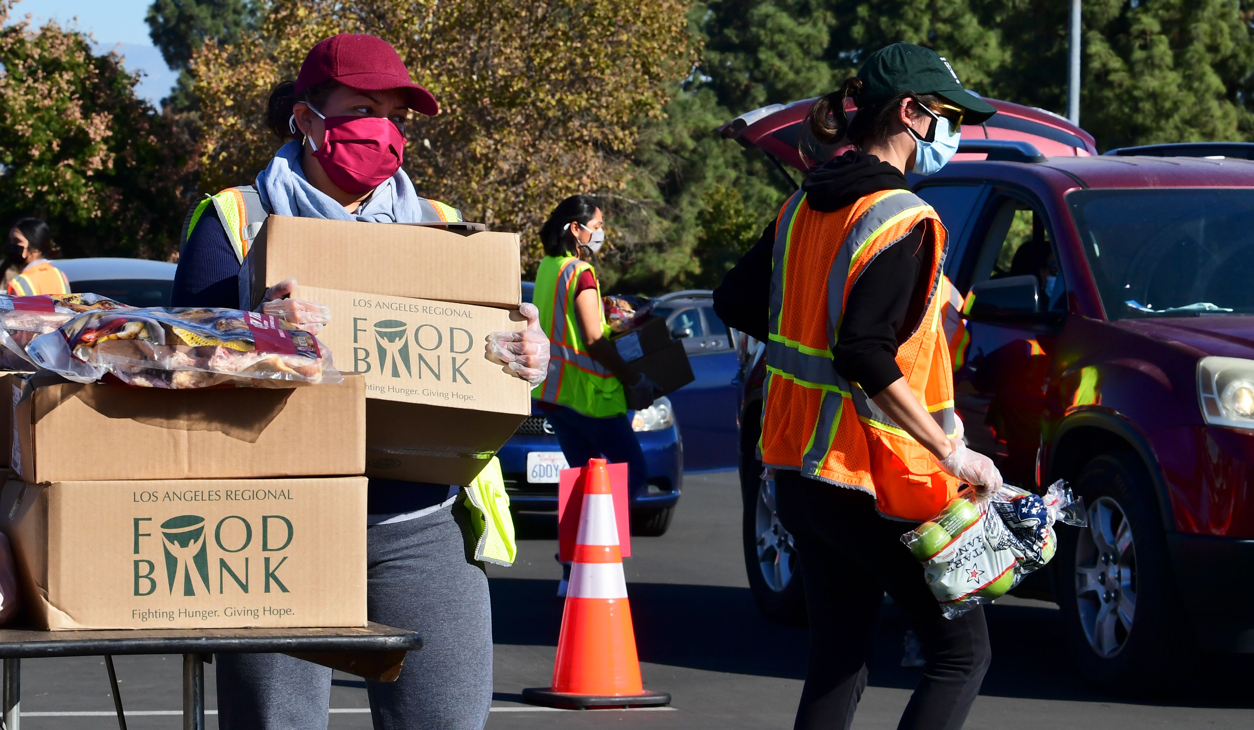 食品在汽车上装载,司机们在洛杉矶的一个食品分发中心排队等候,这是在去年12月。