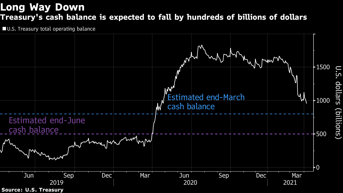 这种资金流失正在积极进行,因为这笔资金被用来资助拜登政府的抗疫援助计划和其他先前授权的支出。财政总账最后一次报告的数额略低于1万亿美元,虽然没有达到财政部的8000亿美元的三月底目标,但已经足够接近。尽管花旗银行的策略师们推测这笔现金可能最终流入风险资产,但显然它正在货币市场基金中进行一次停留。