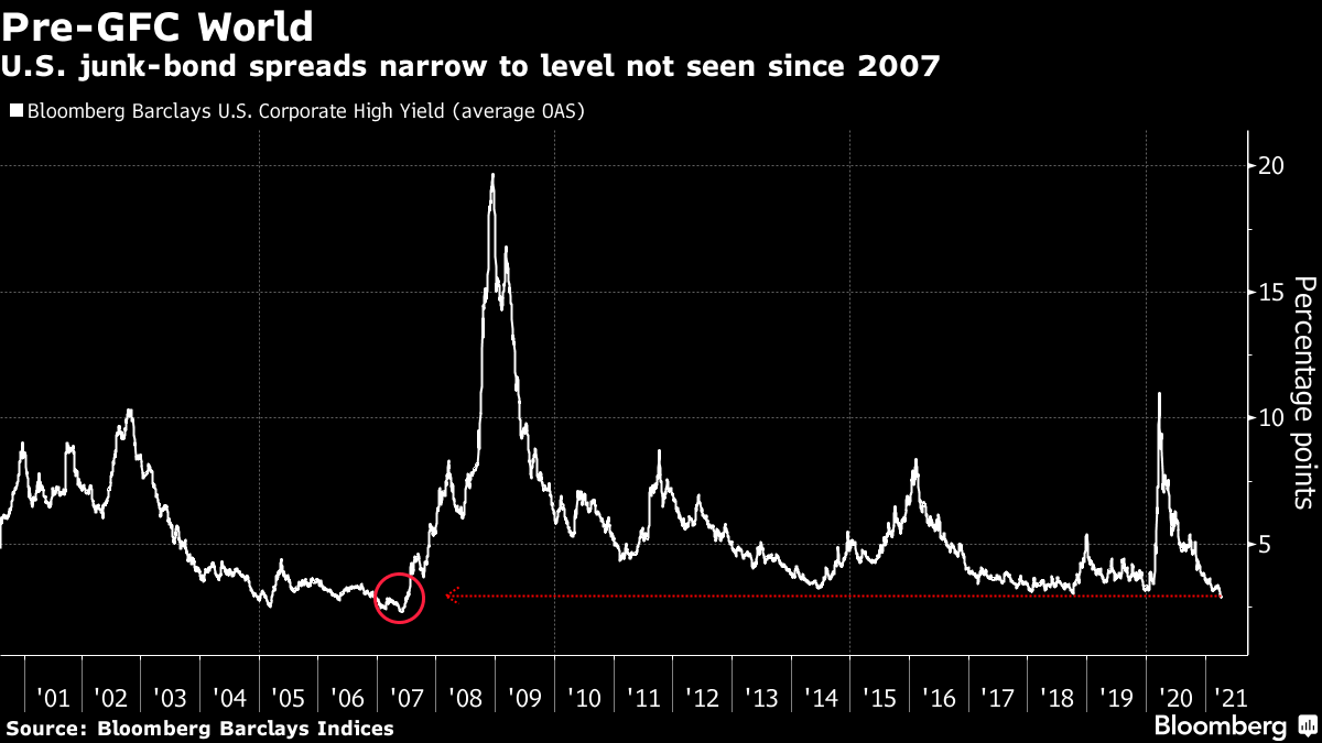 在这一点上,垃圾债券正在蓬勃发展,正如我们的信用记者Paula Seligson所报道的那样。首先,根据彭博巴克莱指数数据,投资者要求持有高收益债券而不是国债的额外收益率首次跌破3个百分点,自2007年以来首次。与此同时,CCC评级债券的平均收益率——违约前的最后评级——周二降至创纪录的6.1%。所有这些都发生在有史以来最繁忙的垃圾债券销售季度。
