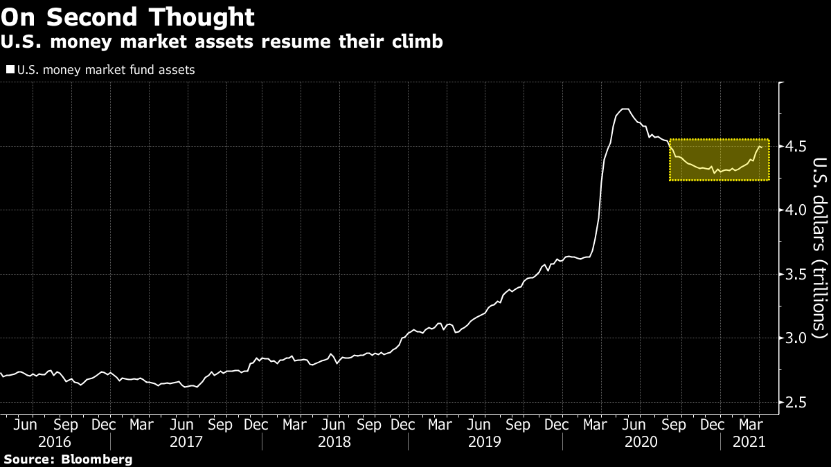 投资者从去年5月资产达到4.5万亿美元的峰值开始,到2020年底,已经从美国货币市场基金中撤出了近5000亿美元。现在它们再次上升。这是因为随着刺激支票的邮寄,这些资金需要找到一个去处。其中一些现金已经成为商业银行存款——从2月底到3月24日约3830亿美元——看起来其余的资金正在被转移到货币市场基金中进行安全保管。