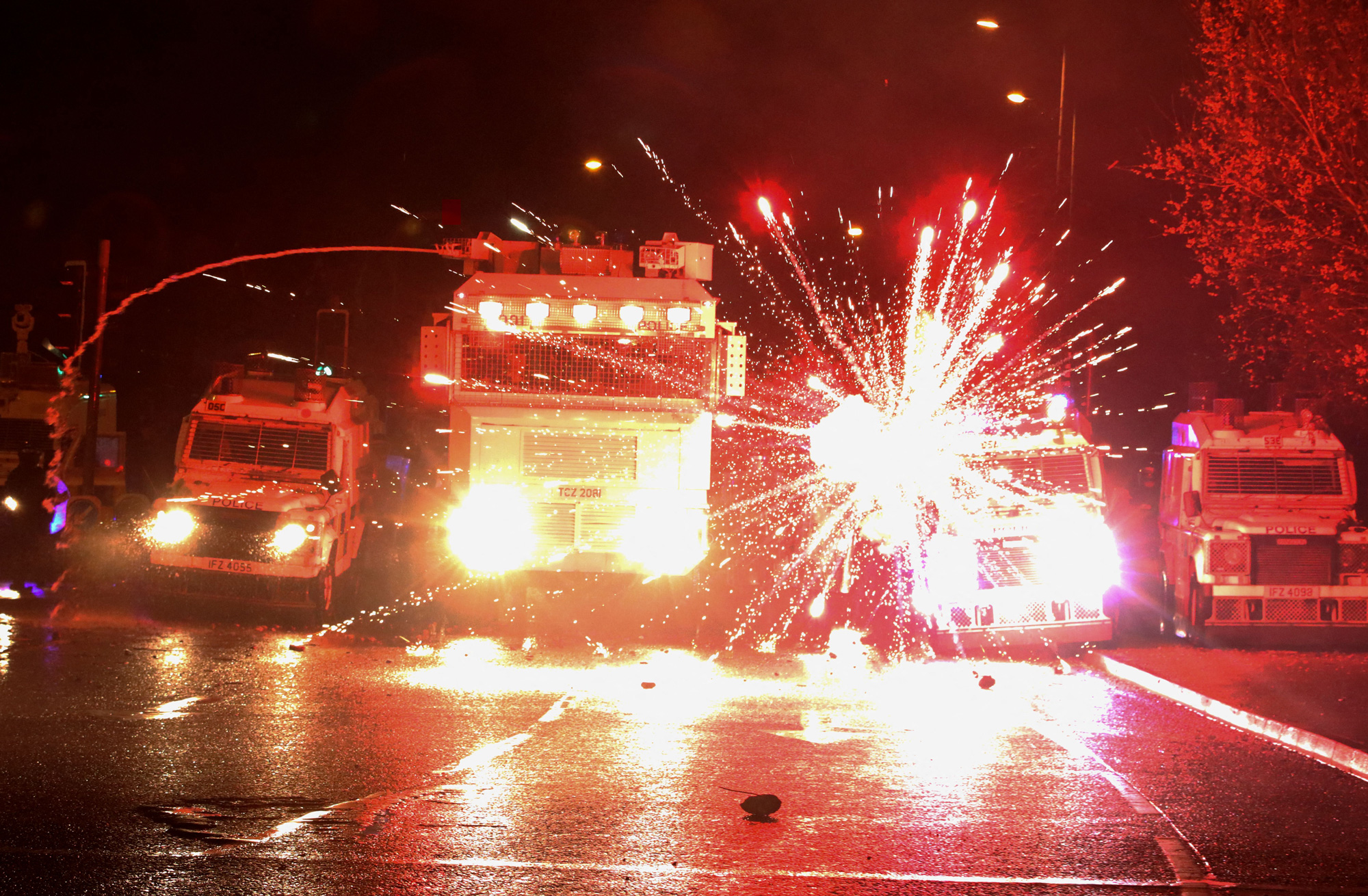 在周四的贝尔法斯特发生的冲突中,烟花在警车周围爆炸。摄影师:保罗·费斯/法新社/盖蒂图片社点击这里 查看本周最引人注目的政治图片,并告诉我们我们的表现如何或者我们错过了什么,发送邮件至 [email protected]*。*