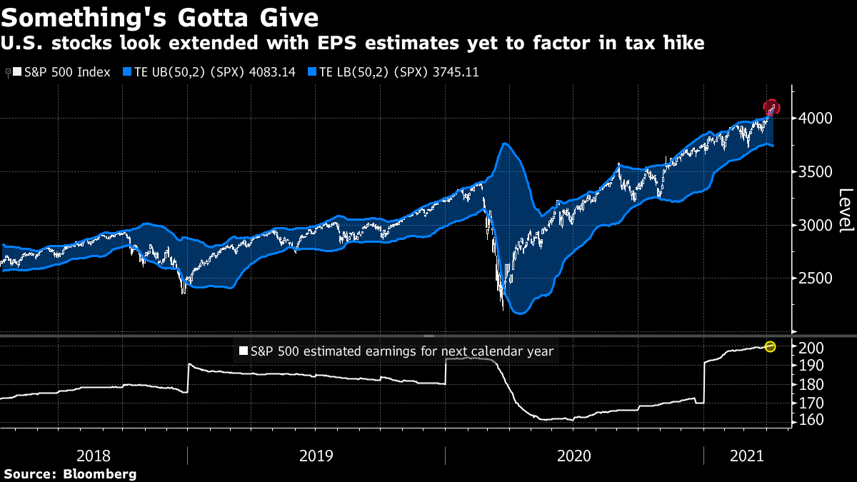 越来越难以证明美国股市当前的估值是合理的,这是因为 — 而不是尽管 — 美国经济正处于高速增长之中。尽管最近4.1万亿美元的刺激措施必将推动经济历史性的复苏,但股市是不同的。它已经预期到了好处,但没有考虑到可能会对支撑其纪录的收益产生影响的三个副作用:更高的税收、上涨的成本和增加的融资费用。高盛上个月计算出,为资助刺激措施计划的税收,如果全部实施,可能会在2022年削减收益高达9%。