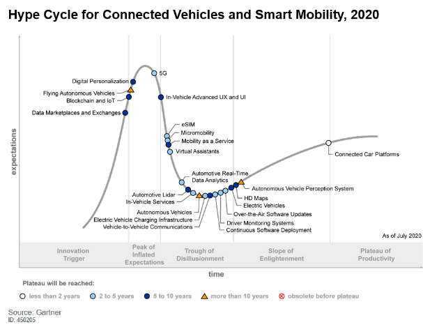 高德纳的高级移动性和交通分析师迈克·拉姆齐是高德纳2018年“互联车辆和智能移动”炒作周期报告的主要作者。该报告将技术的成熟度与其受到的炒作相对比,认为技术被炒作得比它们实际到来的时间要早得多。高德纳的报告称,自动驾驶汽车已经陷入了“幻灭低谷”,这仍然是我有史以来最喜欢的短语之一。炒作周期报告每年更新一次,自动驾驶汽车仍然处于低谷中。