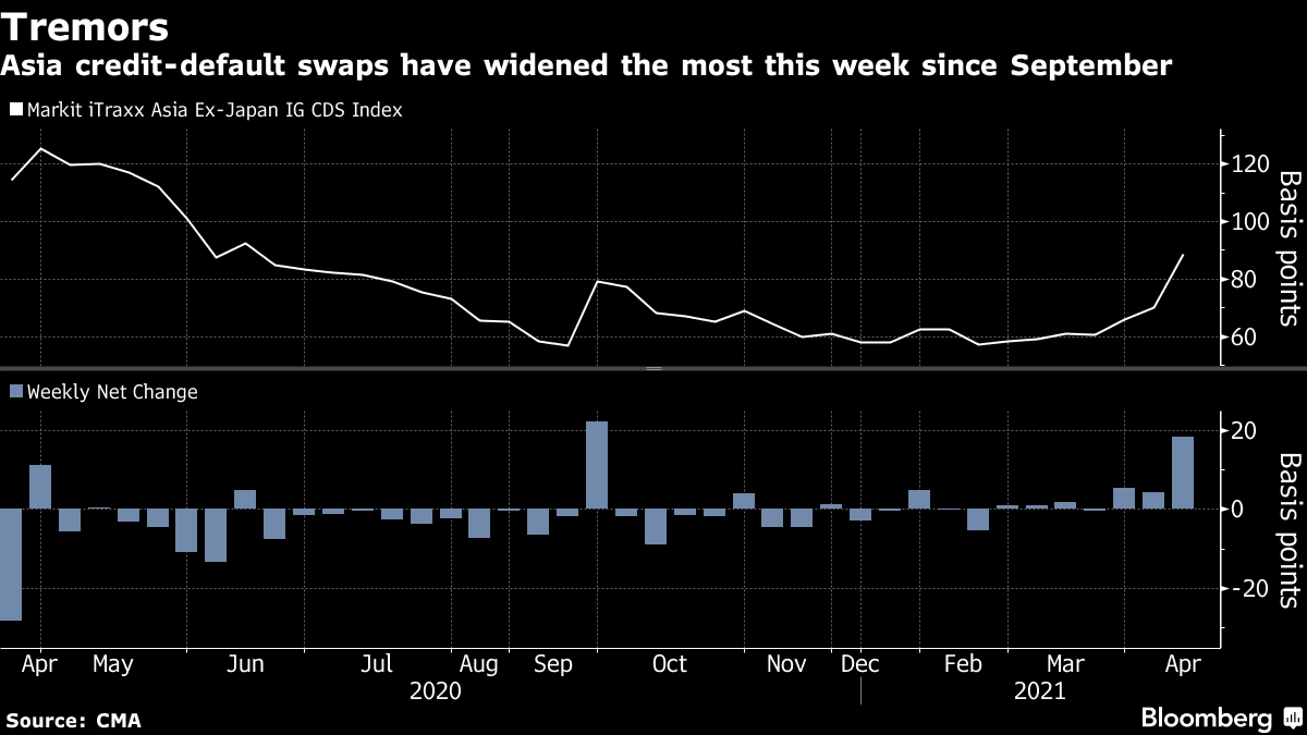 该公司未能在四月截止日期前报告业绩,导致有关违约的讨论使其债券暴跌。亚洲投资级企业债券的利差扩大,本周违约保险费用上涨至去年九月以来最高。