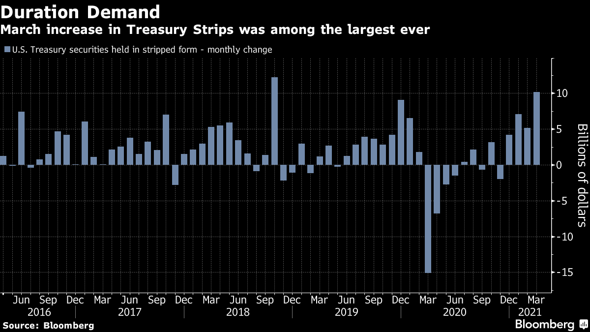 渴望的养老基金。 格温还将这次反弹归因于这些机构对长期债务的最近强烈需求。这体现在对剥离美国国债的需求激增上,这些是提供最大利率风险的超长期零息债券。上个月剥离债券的激增是自2018年10月以来最大的。