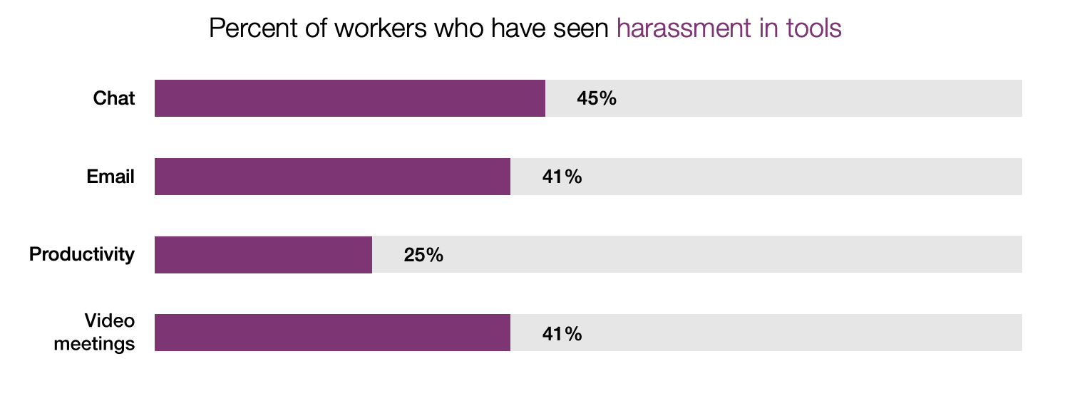 该项由科技倡导组织Project Include进行的研究得出结论,将工作场所的互动转移到互联网上加剧了某些形式的虐待。报告称:“骚扰和敌意已经从实体和面对面的行为转移到在线和技术为基础的形式;它们范围广泛,从在群组视频通话中公开欺凌攻击到通过电子邮件进行1:1的斥责,再到在聊天中分享种族主义和性别歧视的链接等等。”