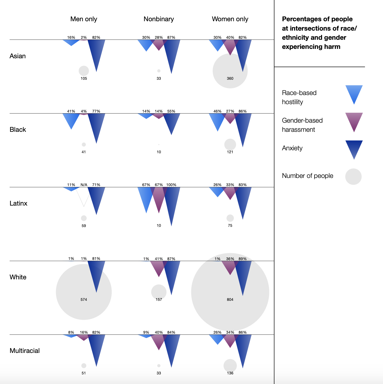 一份调查报告涉及近3000名科技工作者,其中97%在疫情期间远程办公,发现女性、非二元人士、有色人种和50岁以上的工作者在过去一年中经历了不成比例的“工作中骚扰和敌意增加” — 其中很多是基于性别和种族的。