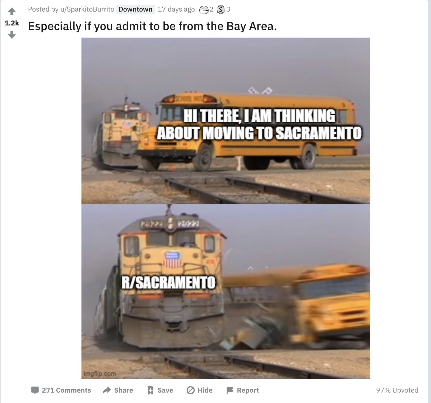 但对于r/Sacramento的人们来说,校车与火车相撞清晰地表达了疫情期间被迫搬迁的新移民和担心被房价挤出市场的居民之间正在加剧的紧张关系。值得警惕的是:一位基于萨克拉门托的房地产经纪人Mairin Haley告诉我,她每周在这座城市至少卖出一套房子,其中四分之三的房子都卖给了湾区的人。