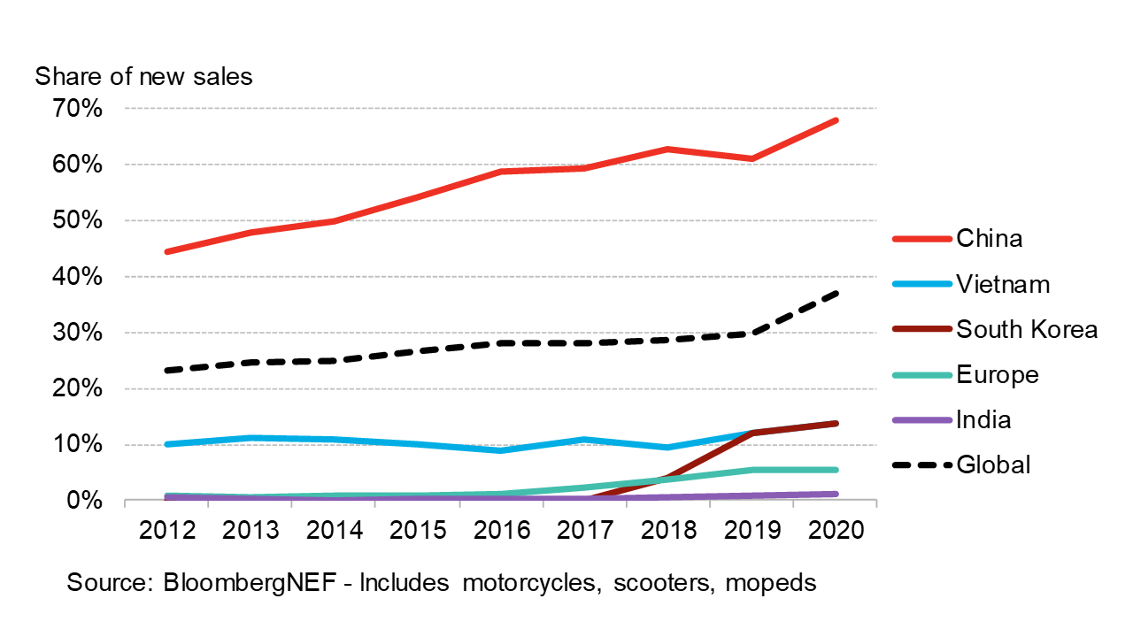 我们在BloombergNEF花费大量时间的一个领域是不同车辆细分市场将何时转向电动化,以及由此导致的竞争动态如何改变。我认为两轮车辆 - 摩托车、踏板车、滑板车 - 是在这两个方面观察最有趣的细分市场。