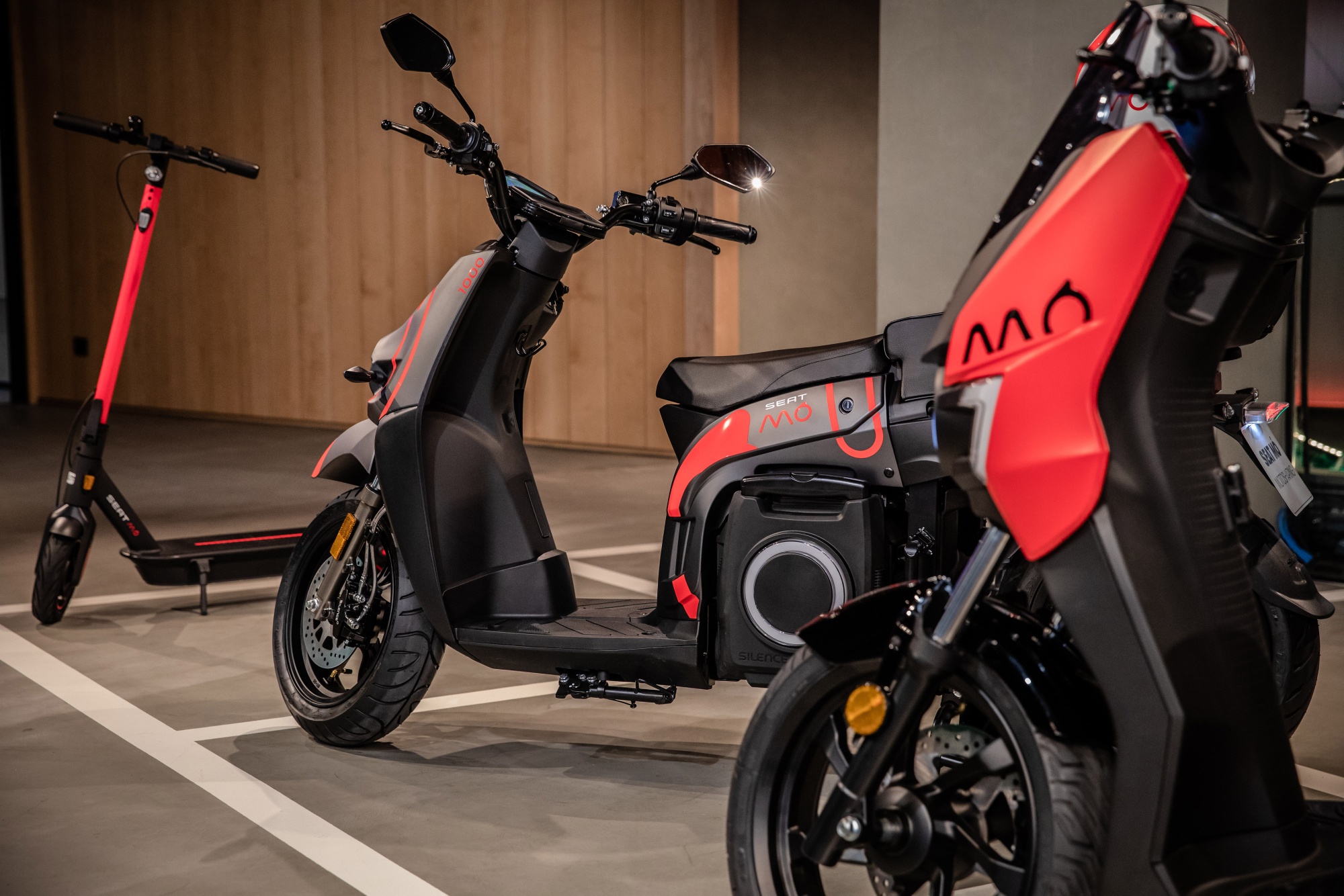 一辆Seat Mo电动滑板车,左边,电动摩托车,中间,以及一辆电动摩托车,在西班牙巴塞罗那的Casa Seat商店。