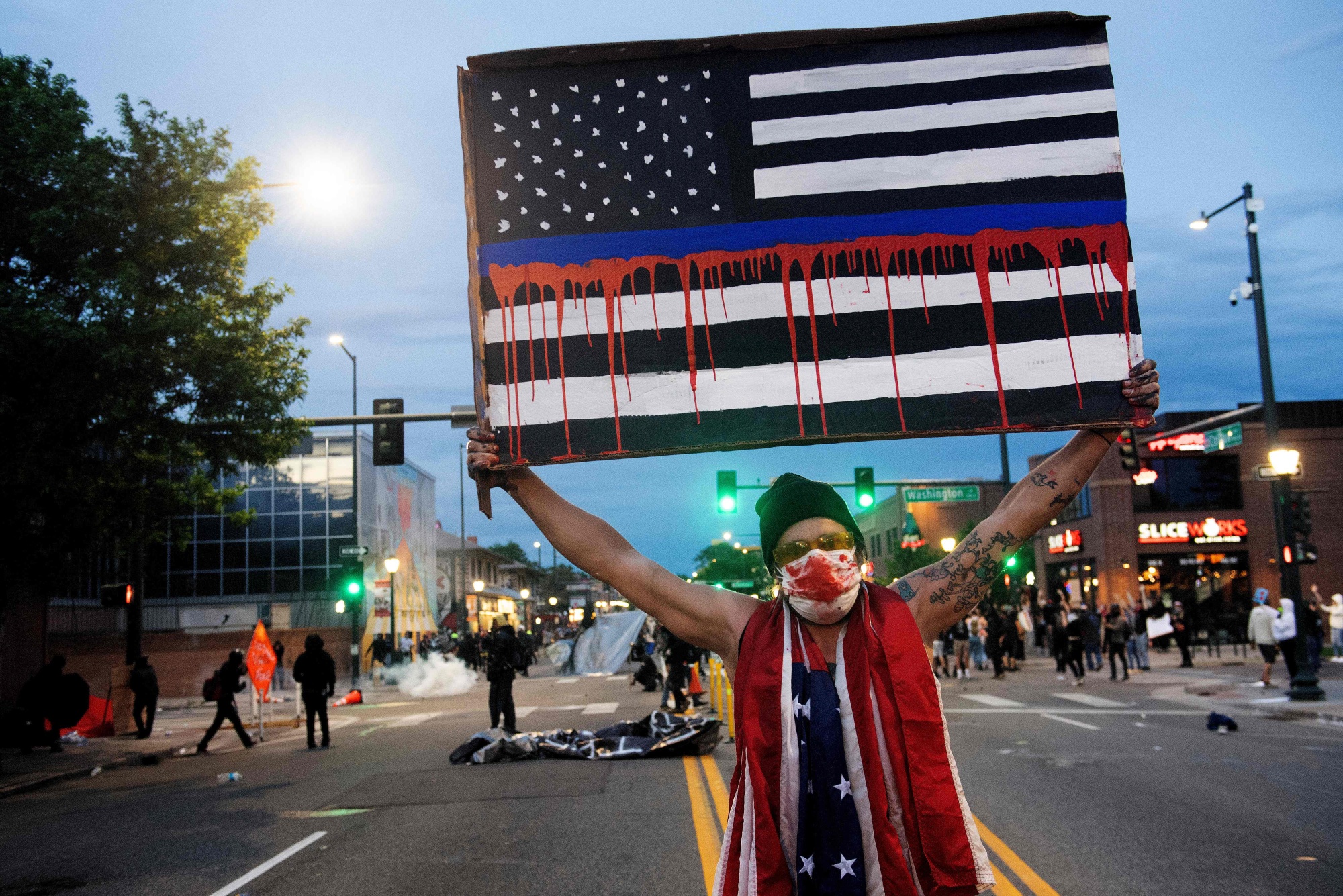 一名示威者在2020年5月31日的科罗拉多州丹佛市抗议活动上举着一面改造过的“蓝色生命至关重要”旗帜,此前明尼阿波利斯市明尼苏达州的乔治·弗洛伊德被警察杀害。这面旗帜已被白人至上主义团体采用,作为对“黑人的命也是命”运动的反应,该运动旨在结束美国警察对像弗洛伊德这样的手无寸铁的黑人的杀害。