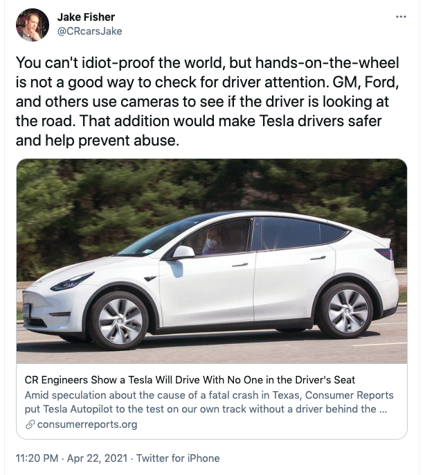 消费者报告工程师表示,他们“轻松地”在测试车队中的一辆特斯拉Model Y上欺骗了自动驾驶系统,让车辆在没有任何人在驾驶座位上的情况下行驶。这家非营利产品评论员在德克萨斯州发生一起致命车祸几天后发布了他们的调查结果,警方称他们在一辆特斯拉汽车后面发现没有人在驾驶座上,该车最终驶出路面撞向了一棵树。消费者报告的汽车测试高级主管杰克·费舍尔(Jake Fisher)在推特上发文称,特斯拉应该开始使用摄像头监控驾驶员是否在看路。
